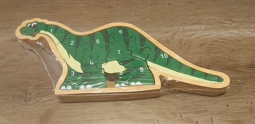 Adorable wooden dinosaur puzzle. Ten numbered pieces. New in plastic packaging.