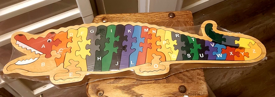 Adorable wooden alligator puzzle. Features the alphabet. Great for learning and fun. Rainbow colours. New in plastic wrapping.