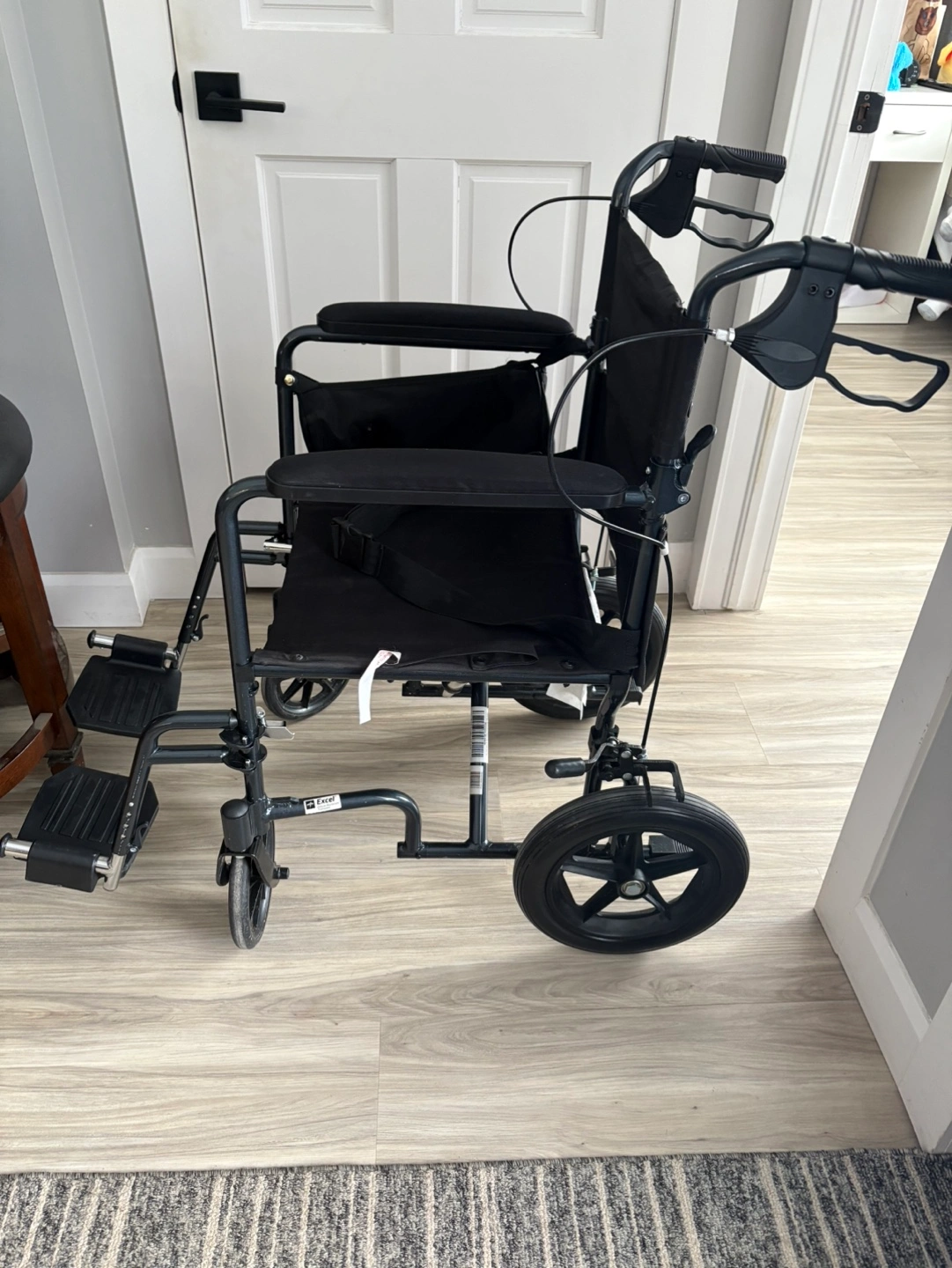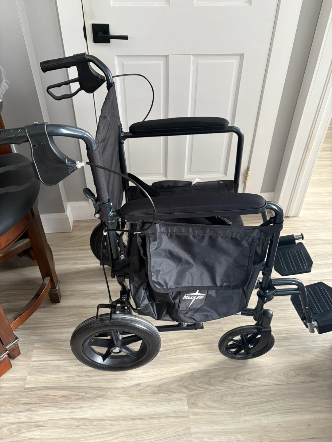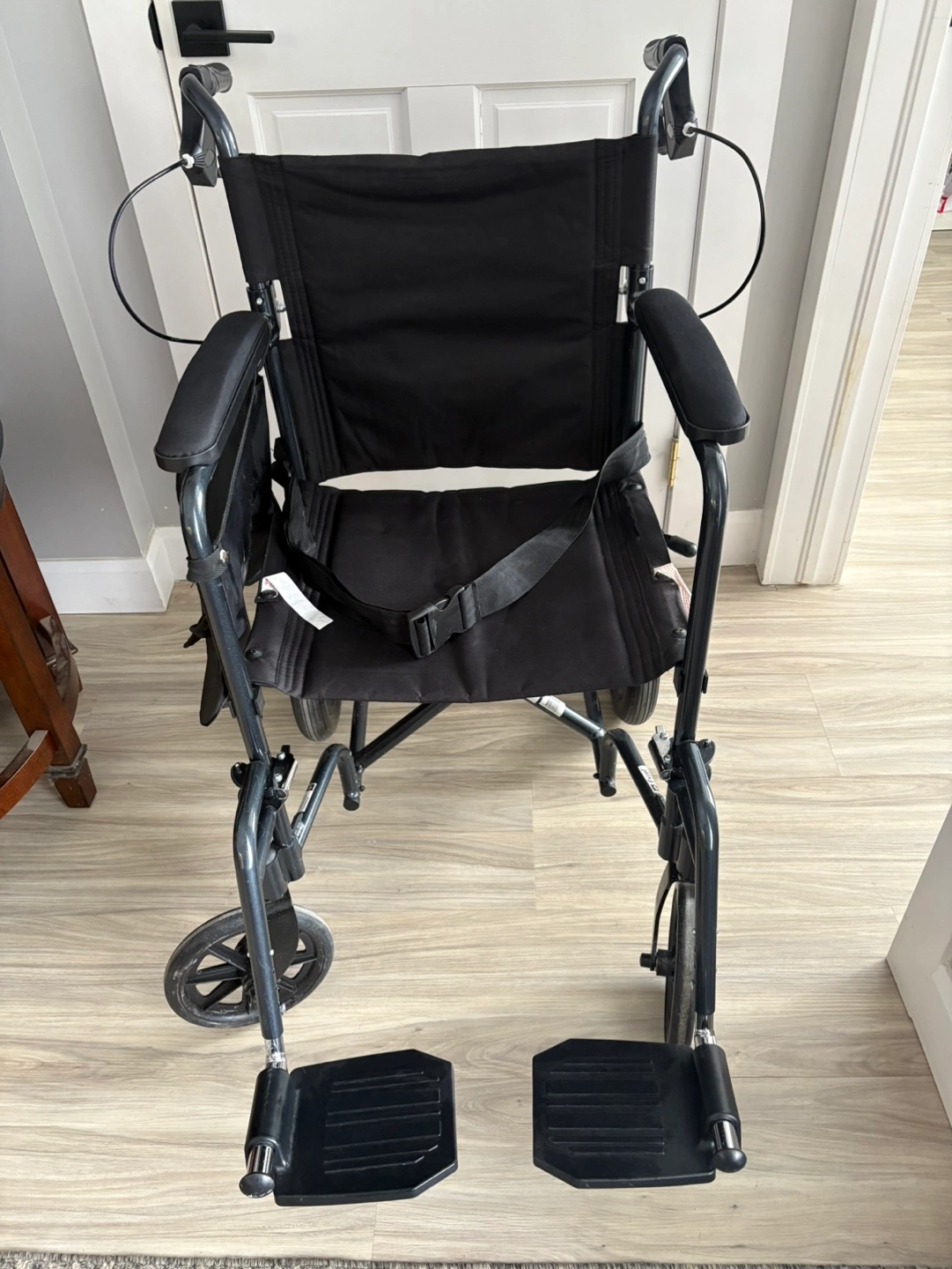 Black transport wheelchair. Features include: folding frame, adjustable footrests, and a storage pouch. Excellent condition.