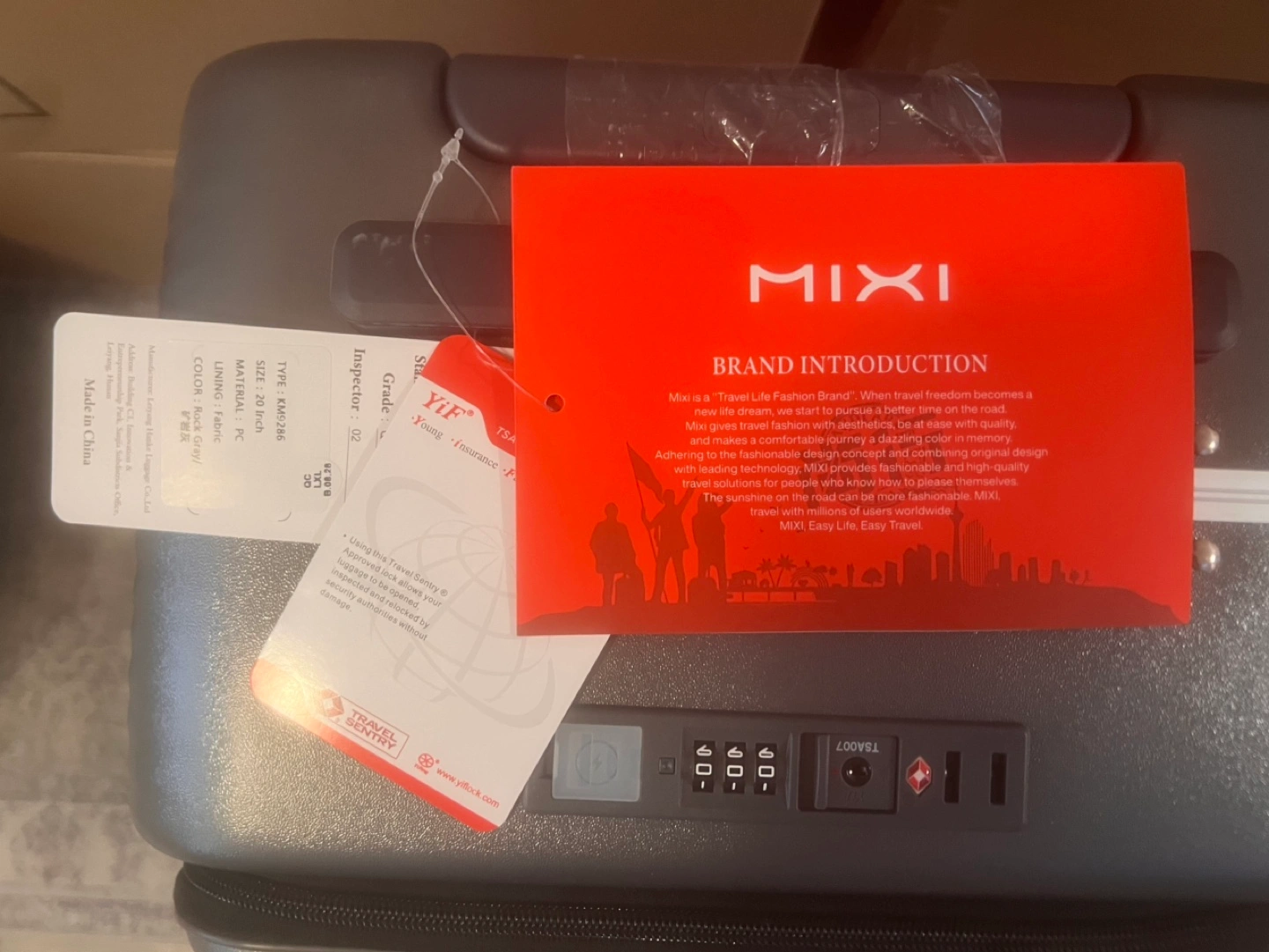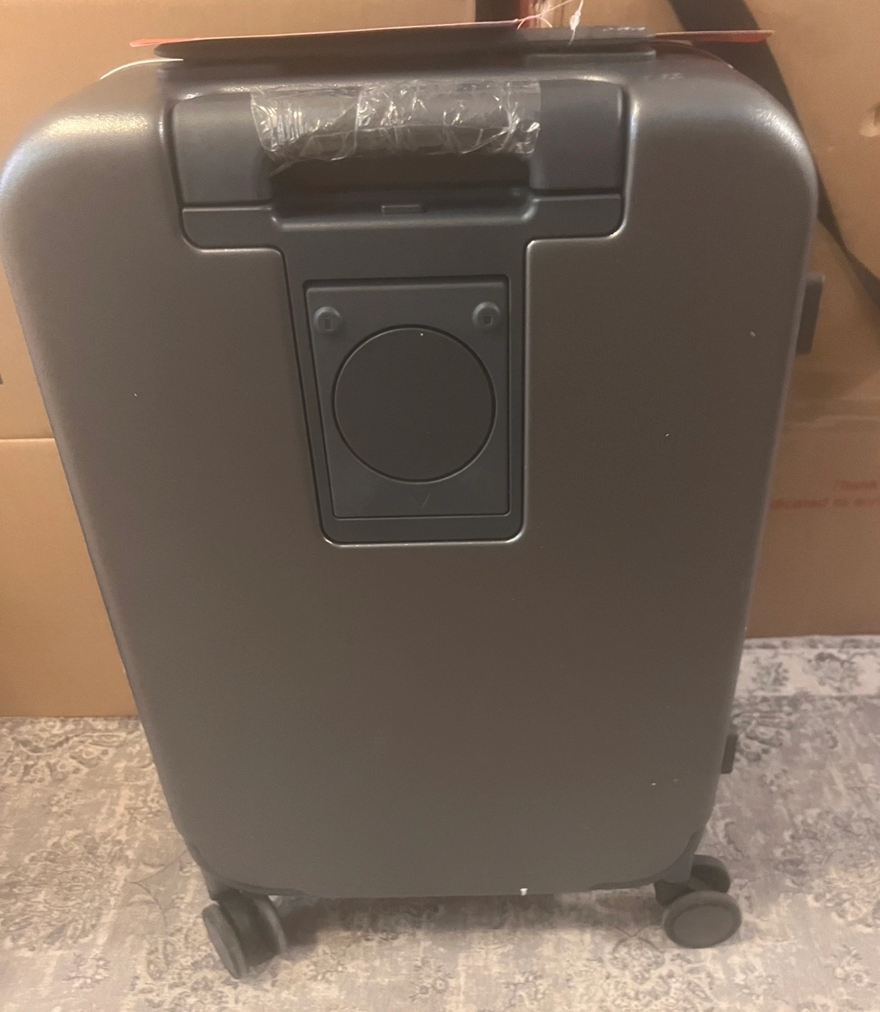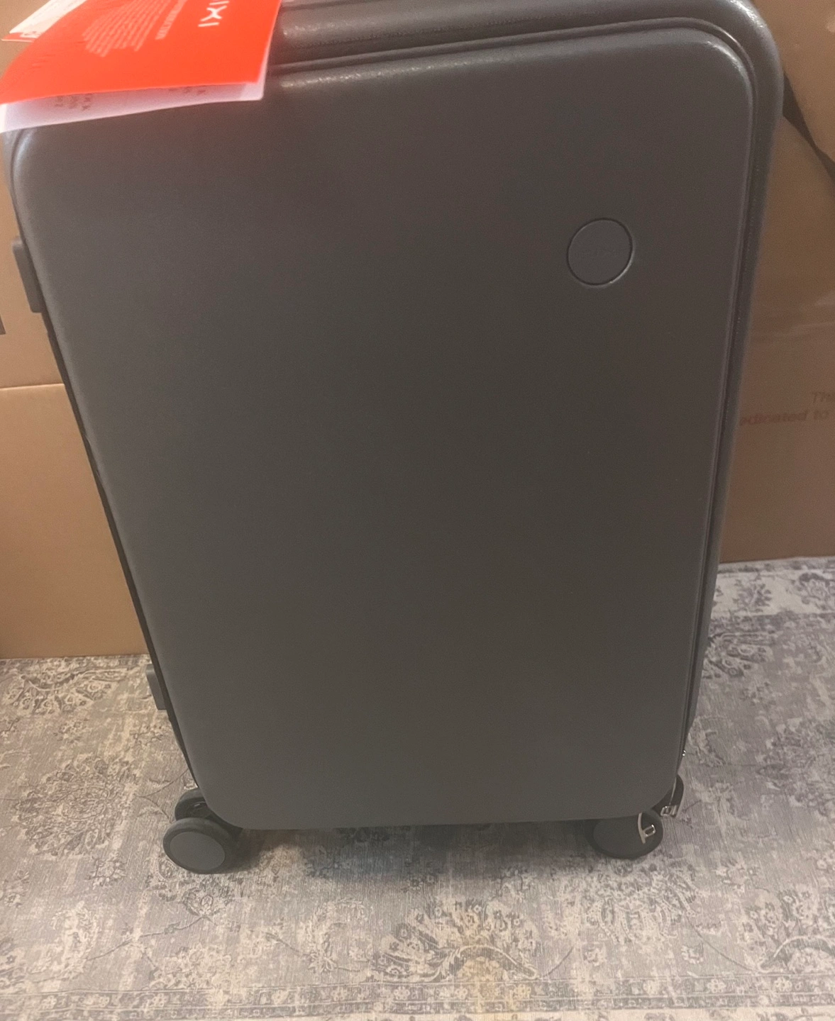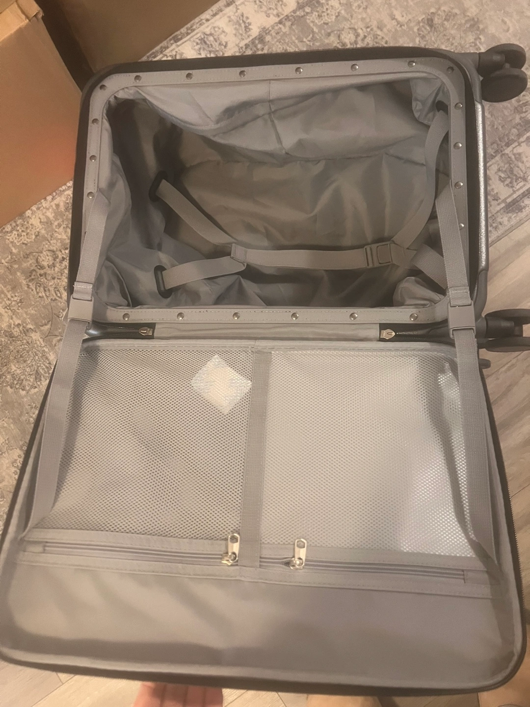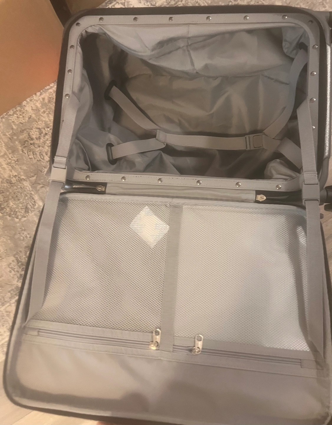 Hard shell carry-on suitcase. Grey colour. TSA-approved combination lock. Interior features include zippered compartments and tie-down straps. Excellent condition.