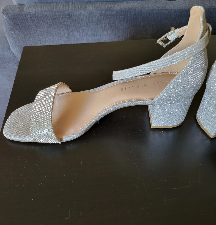 Silver glitter sandals. Block heel. Ankle strap with buckle closure. Rhinestone detail across the toe strap. Excellent condition and only worn once. Perfect for prom, weddings or any other special occasions. Fits on the slightly larger side and probably closer to a size 8.5.
