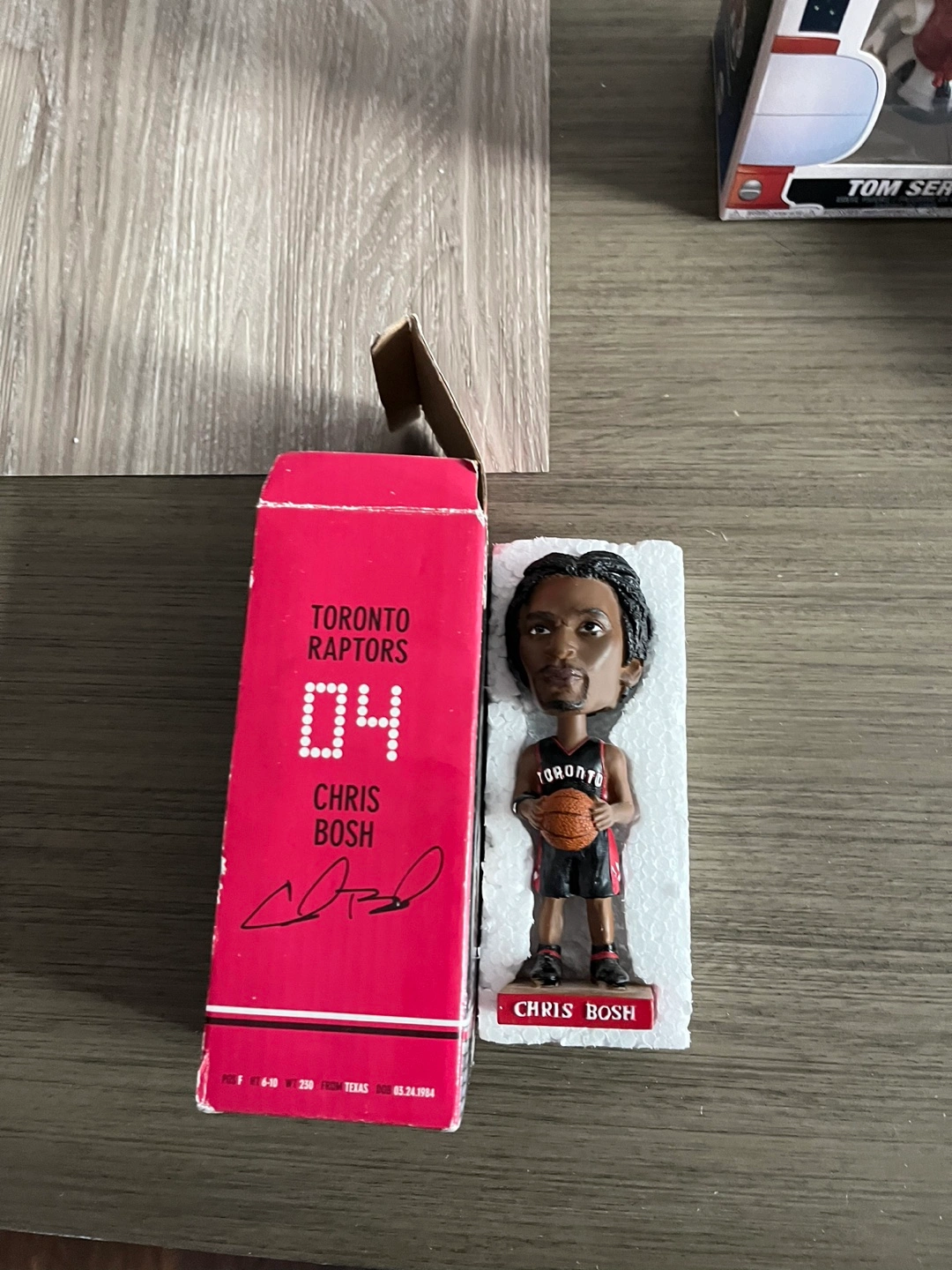 Collectible Chris Bosh bobblehead. Features Chris Bosh in a Toronto Raptors uniform. Comes in original box. Limited edition.