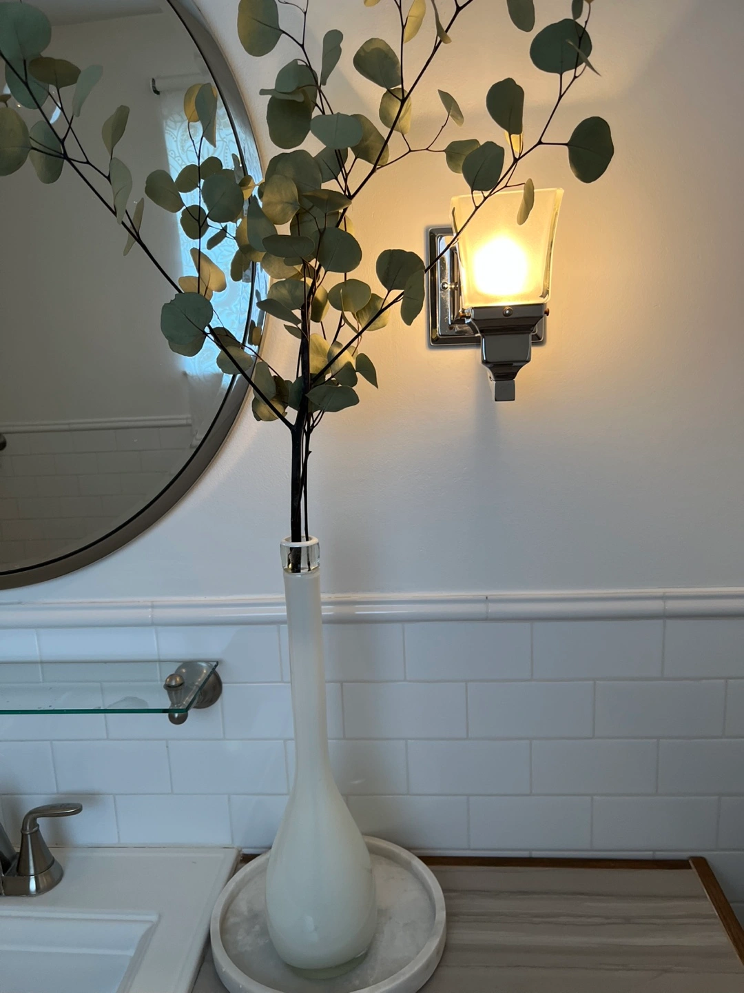 Tall, slender, white glass vase. Perfect for displaying dried flowers or branches. Modern and minimalist design.
