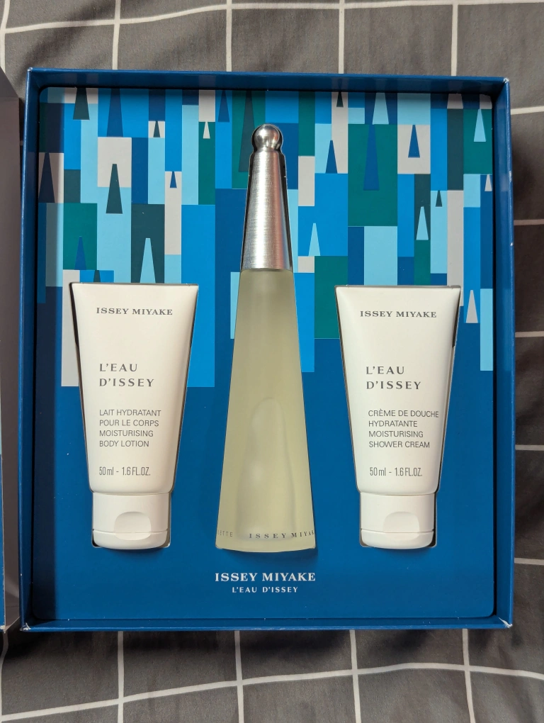 New, unopened gift set. Includes Eau de Toilette, body lotion, and shower cream. Perfect gift.