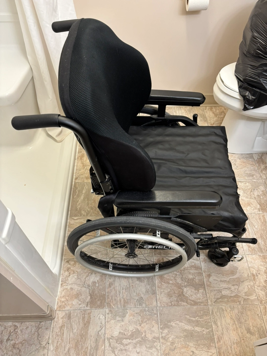 Wheelchair; collapses for easy transport. ROHO pressure relief seated cushion to prevent pressures sores. Comes with attached legs! Used indoors or outdoors!