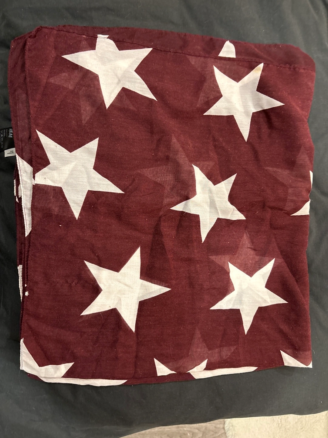 Lightweight scarf. Maroon coloured fabric with white stars.