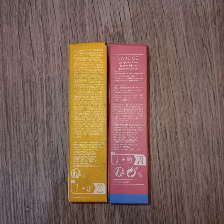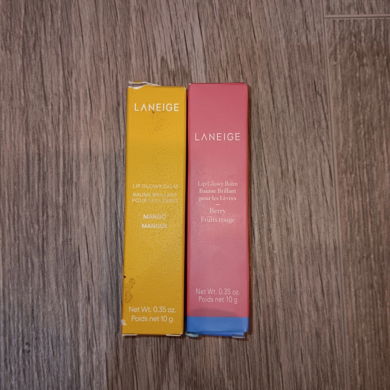 Two LANEIGE Lip Glowy Balms. Flavours: Mango and Berry. Net weight: 0.35 oz each. New, unopened boxes. Boxes are a bit damaged.