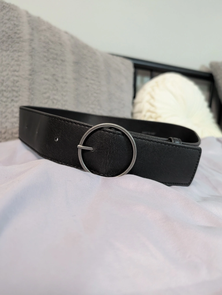 Black faux leather belt. Circular silver buckle. Measures approximately 35 inches. pick up South Vancouver or Richmond