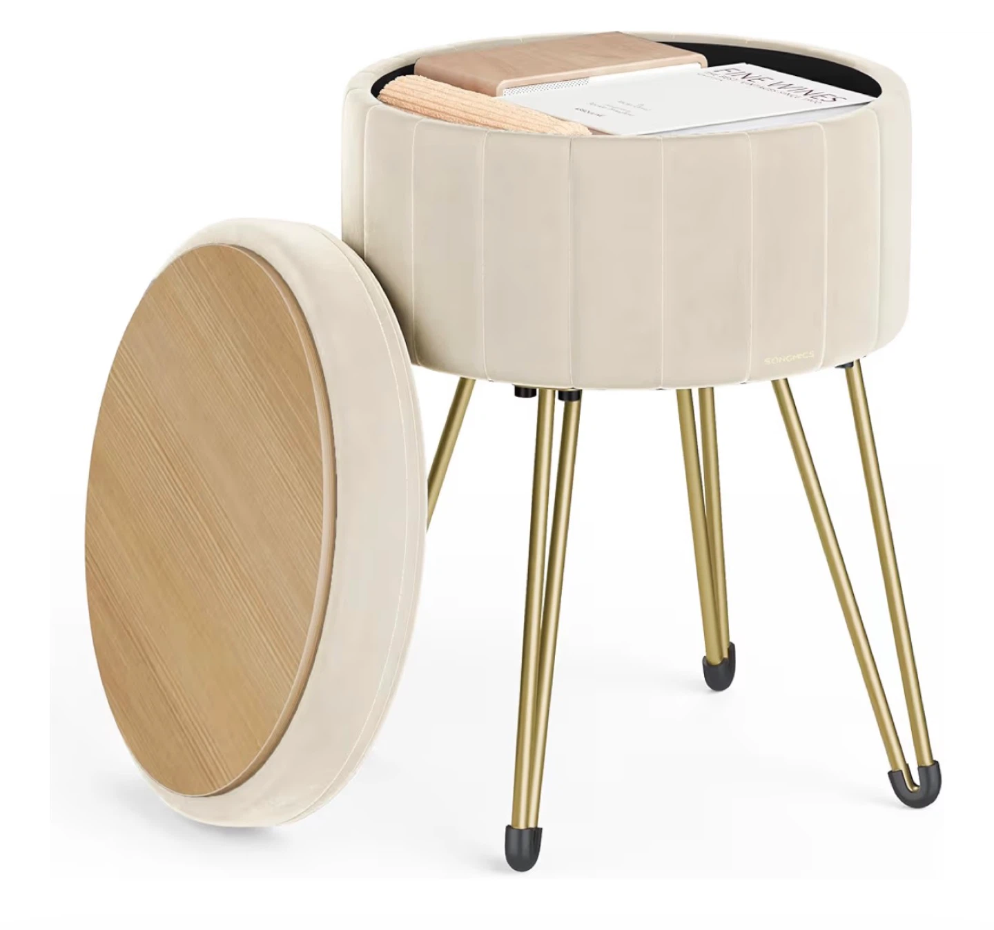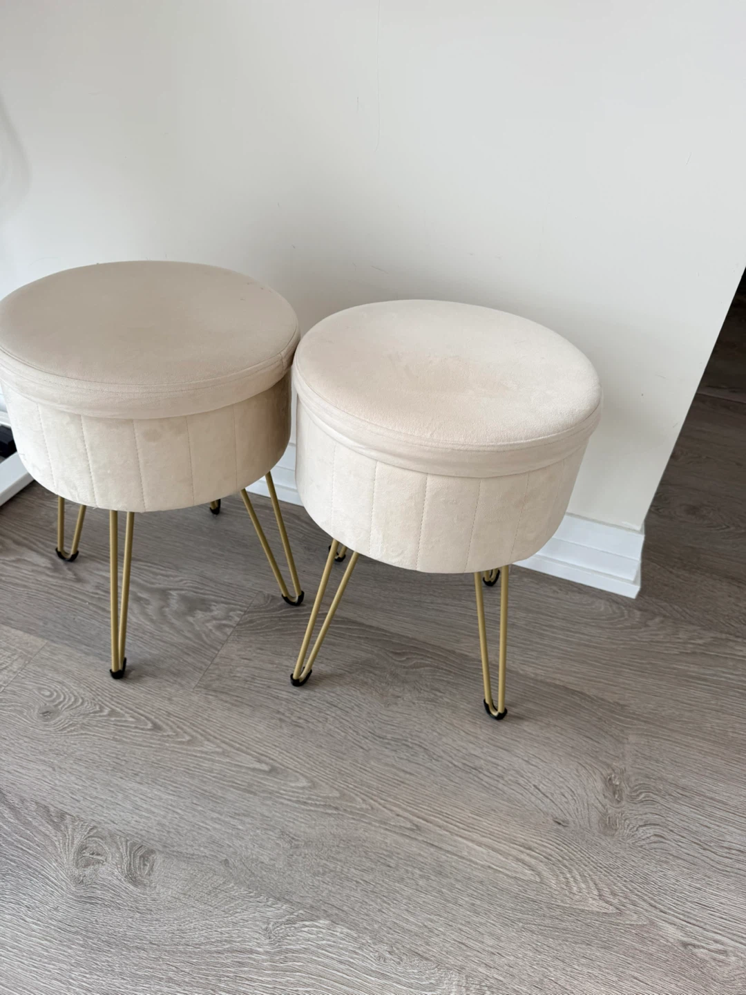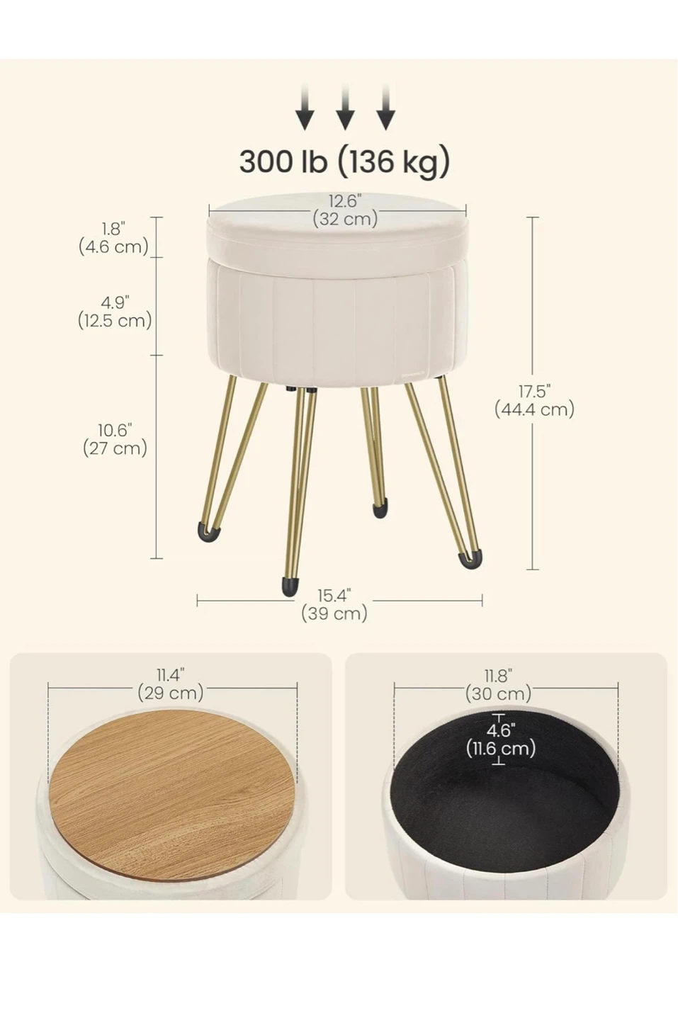 This cream velvet storage ottoman is a stylish and practical addition to any room. It features a hinged lid for convenient storage and rests on elegant gold legs. The soft velvet upholstery adds a touch of comfort, and it's perfect for stashing blankets, books, or other essentials. The approximate dimensions are 17.5" high and 12.6" in diameter.