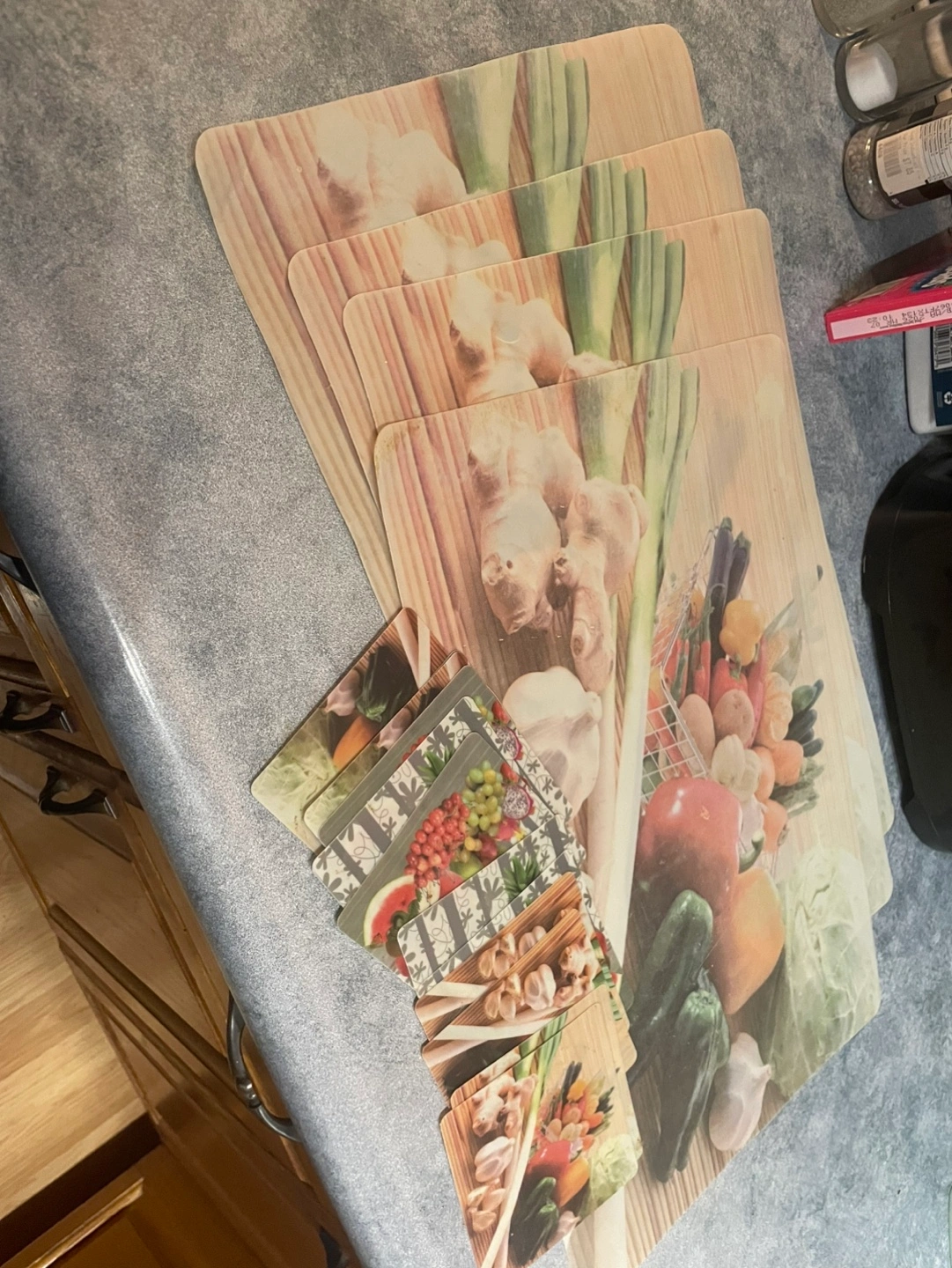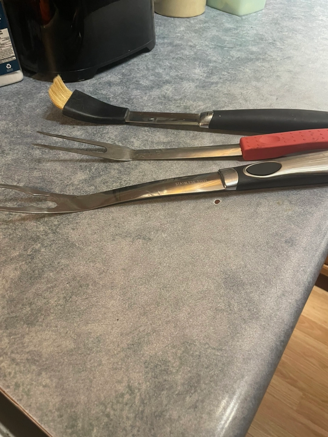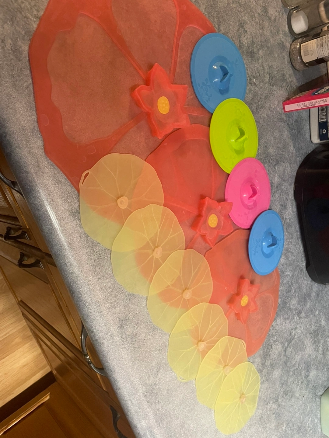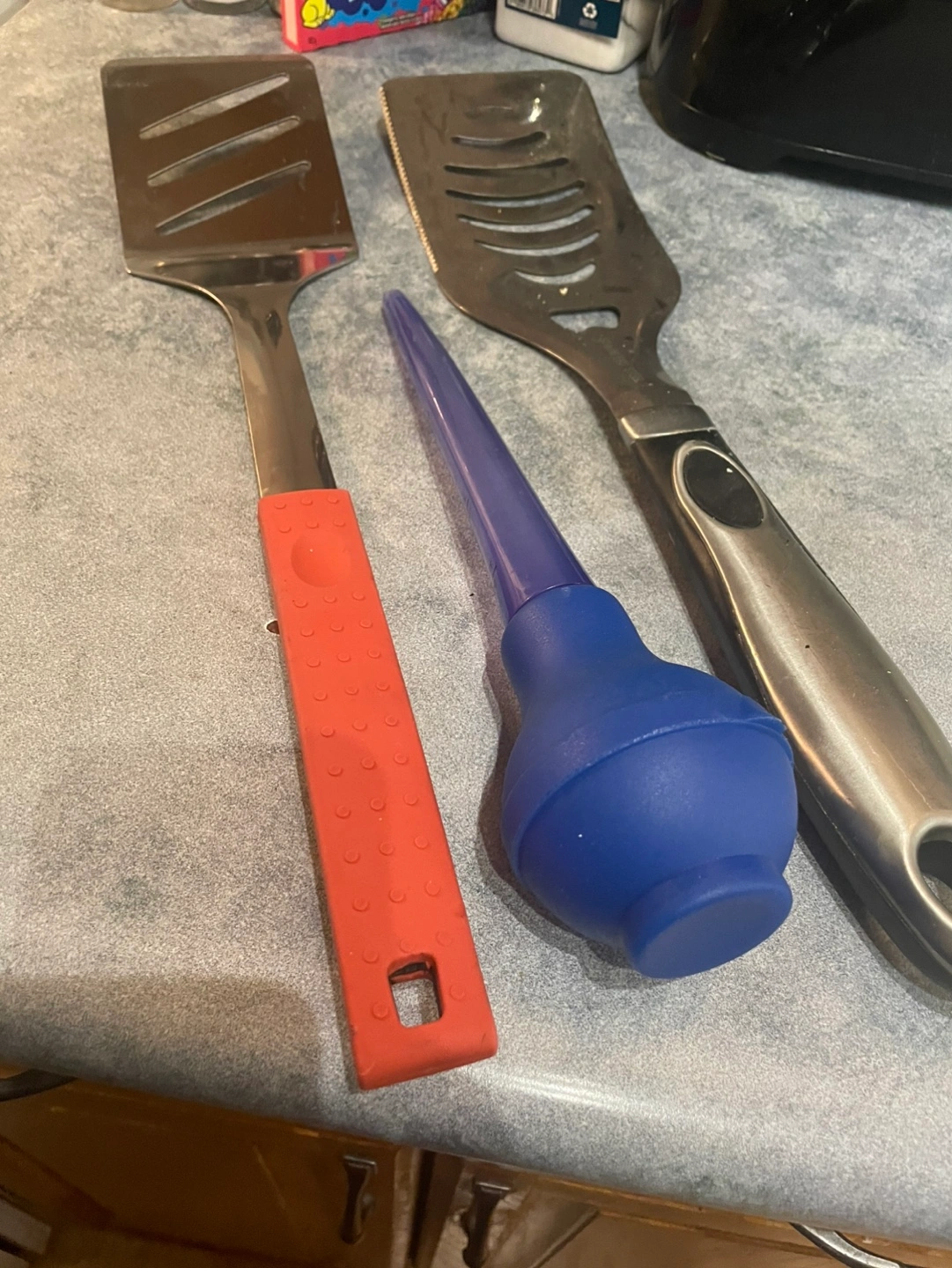 406So many tongs! Plus flippers, a brush for yummy marinades, a baster, poky things to use when picking up a ham from a roaster! And placemats, coasters, oven mitts. AND silicone covers for keeping bugs away from bowls of yummy food and drinks.