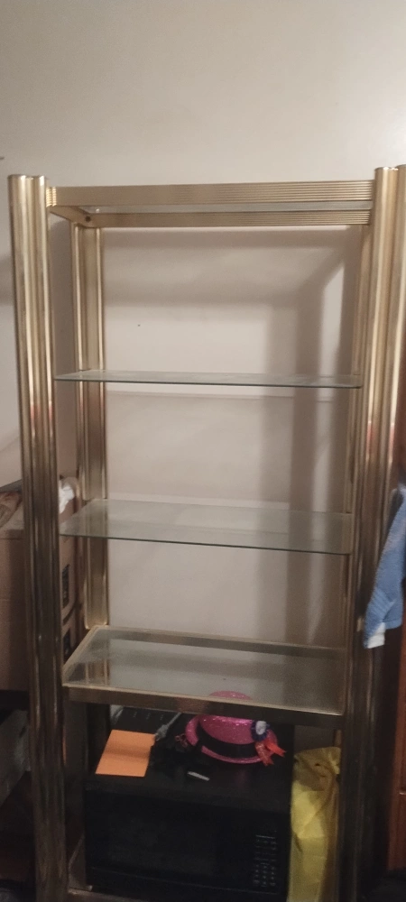 Free-standing shelving unit. Gold metal frame. Three glass shelves. Ideal for displaying items or organizing a space. Shows some wear. It does come apart for easier moving but the poles are still 6 feet tall. You will need a pick up or SUV if you want it. please check the measurements before contacting me.