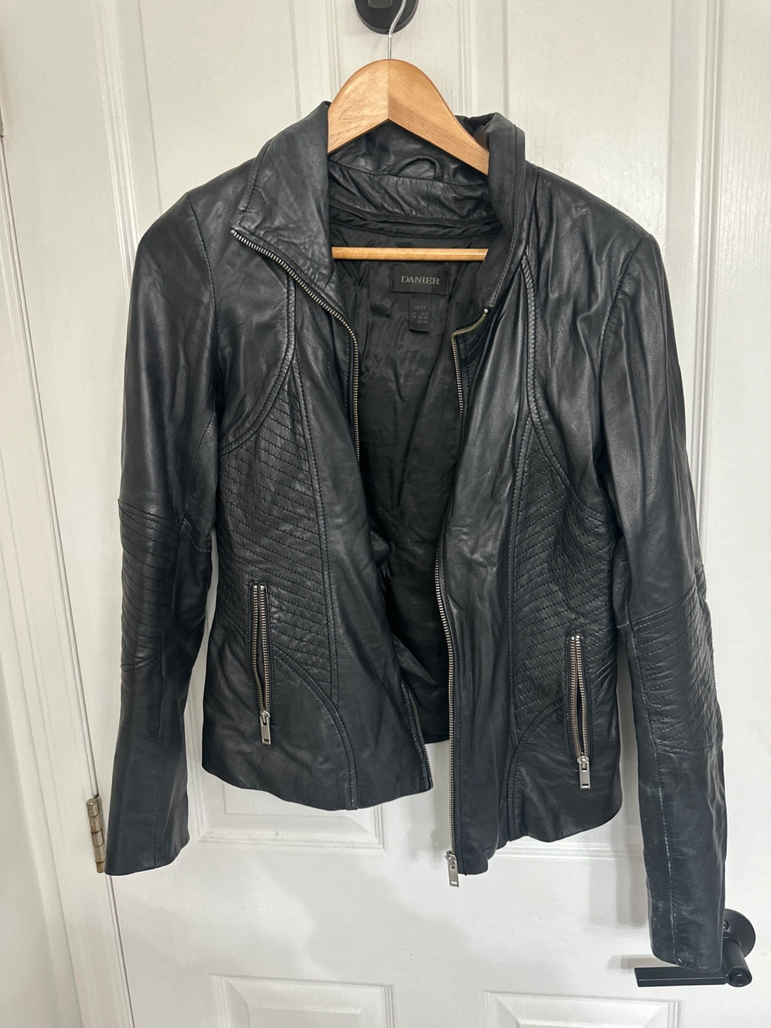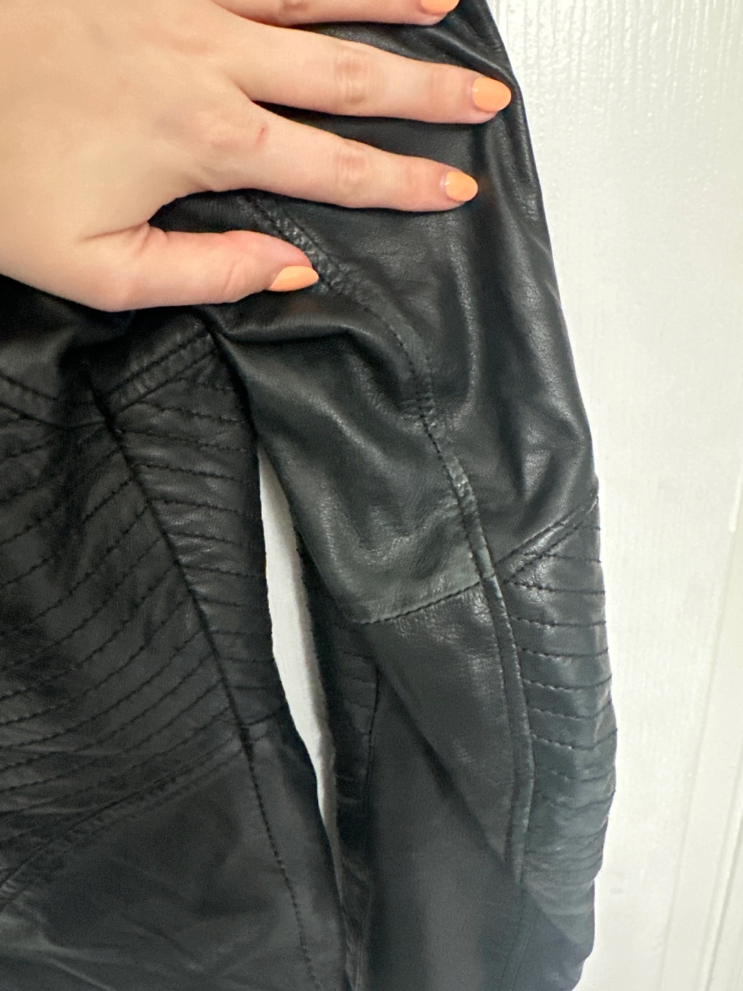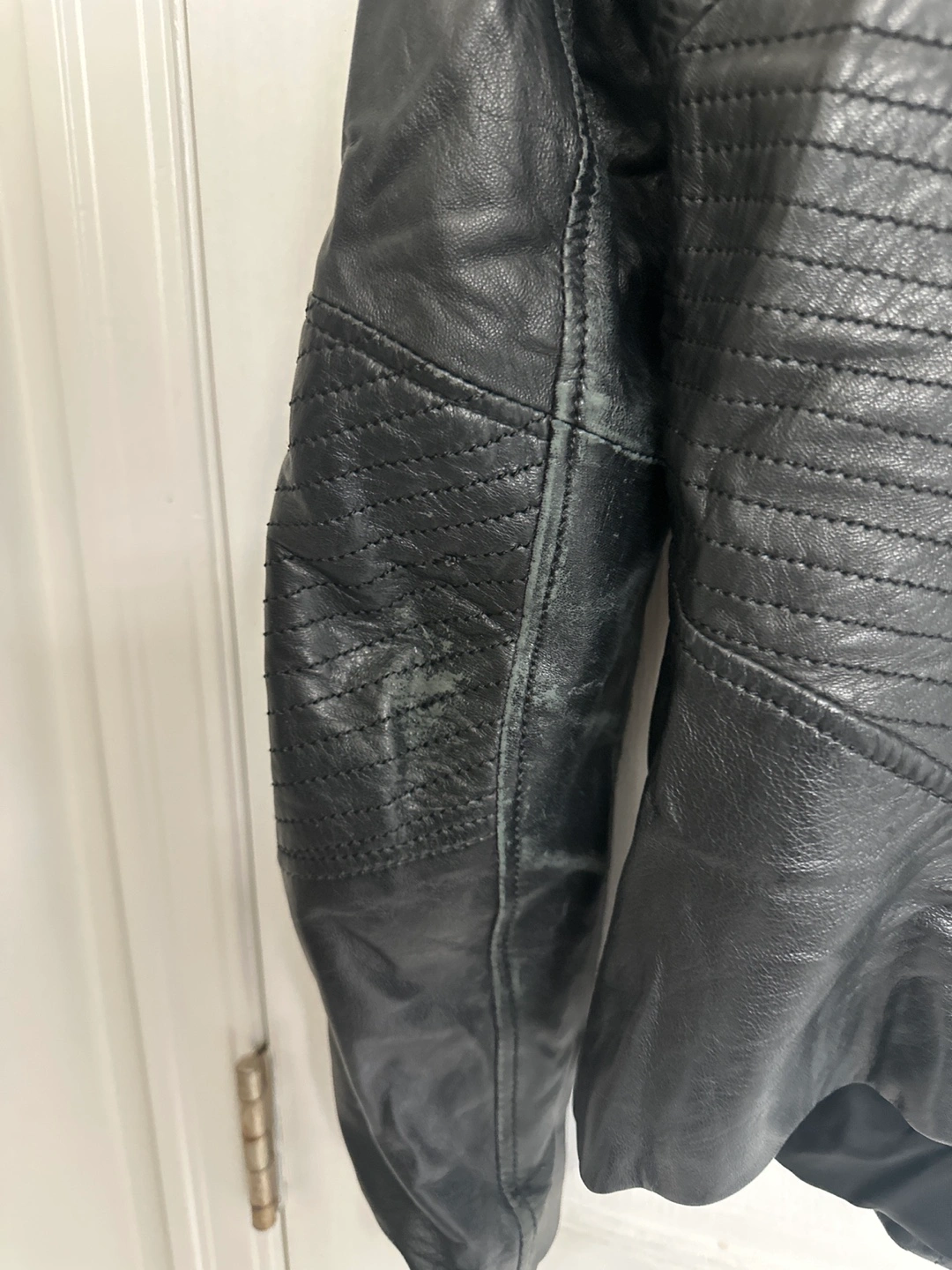 Women's black leather moto jacket. Size small. Features zipper closure and multiple pockets. Some wear and tear visible- typical true leather