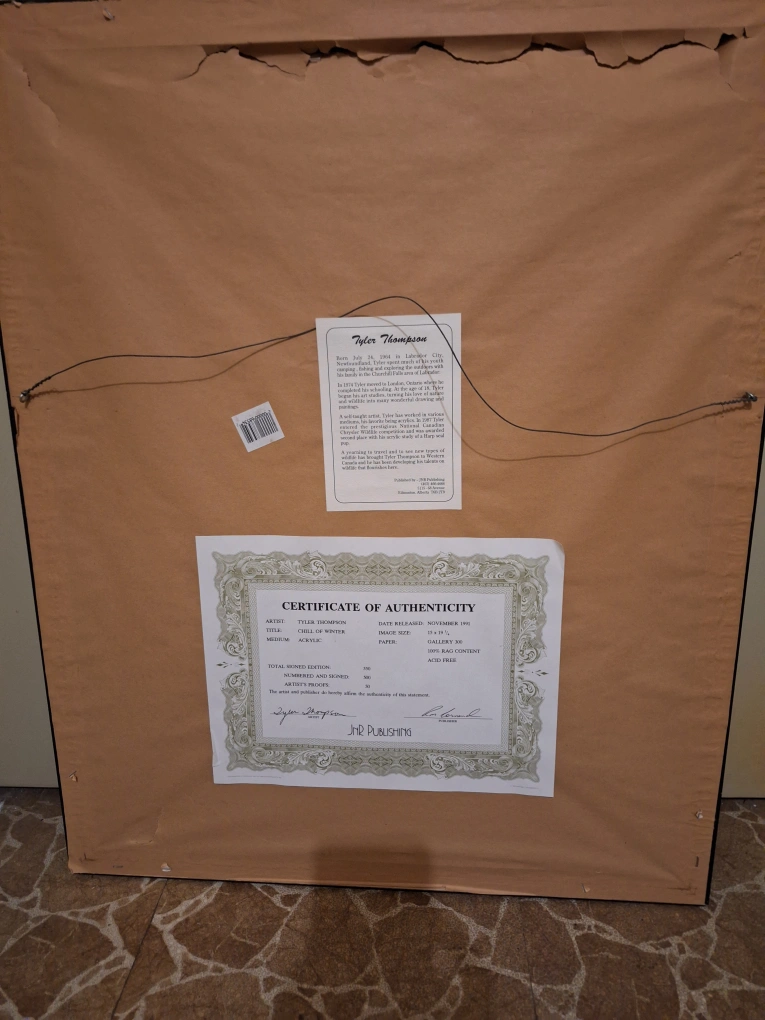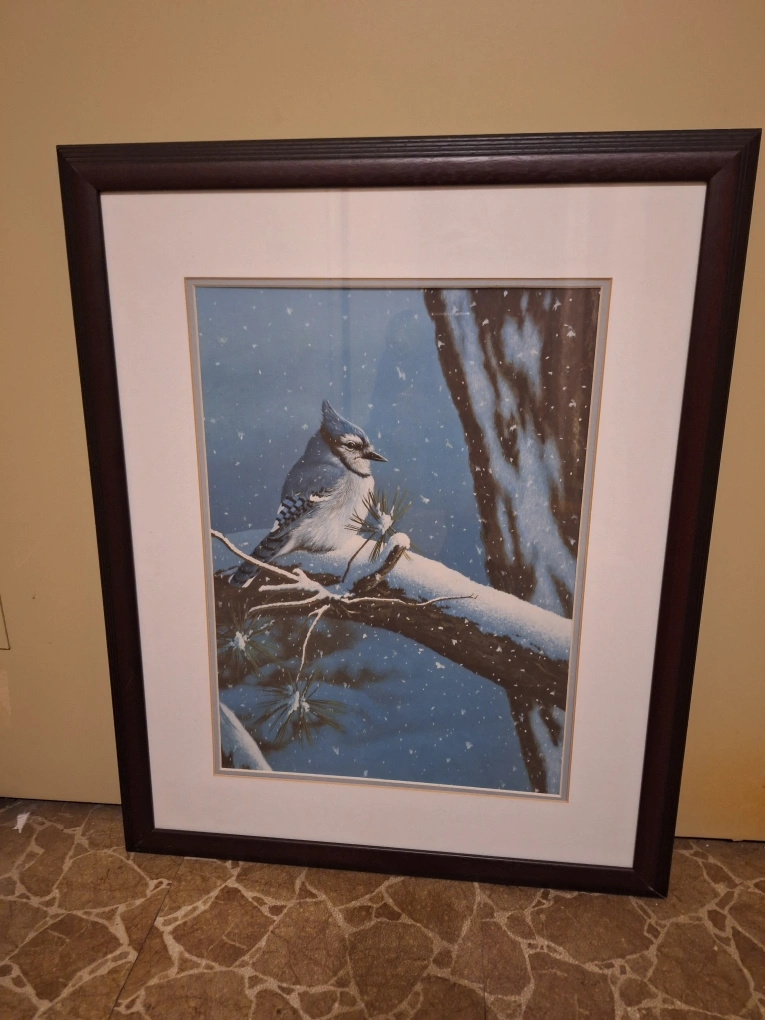 Framed art print featuring a blue jay. Dark brown frame. Certificate of authenticity included. Appears to be a limited edition print. Beautiful addition to any home. Dimension 21.5x26.5