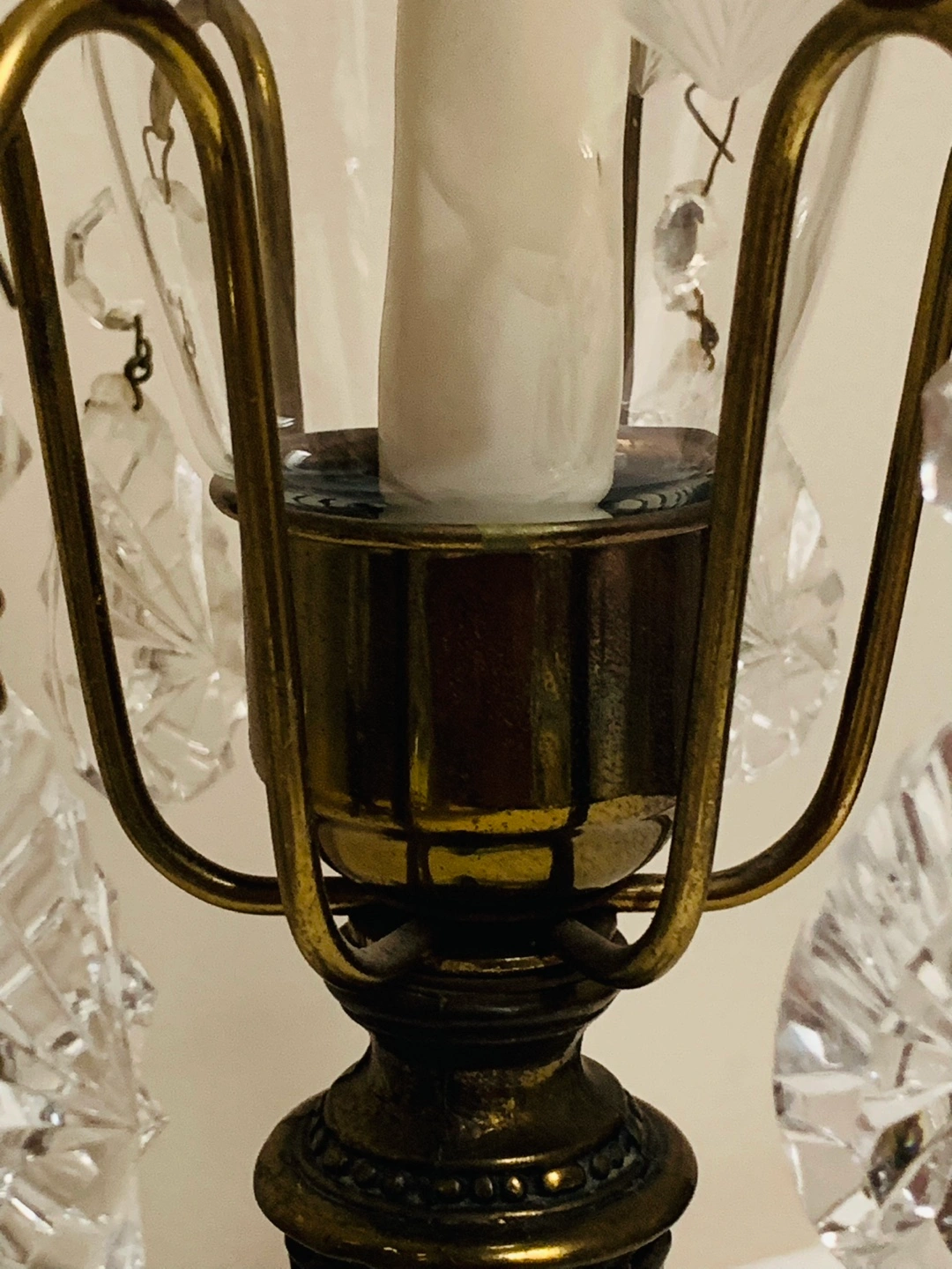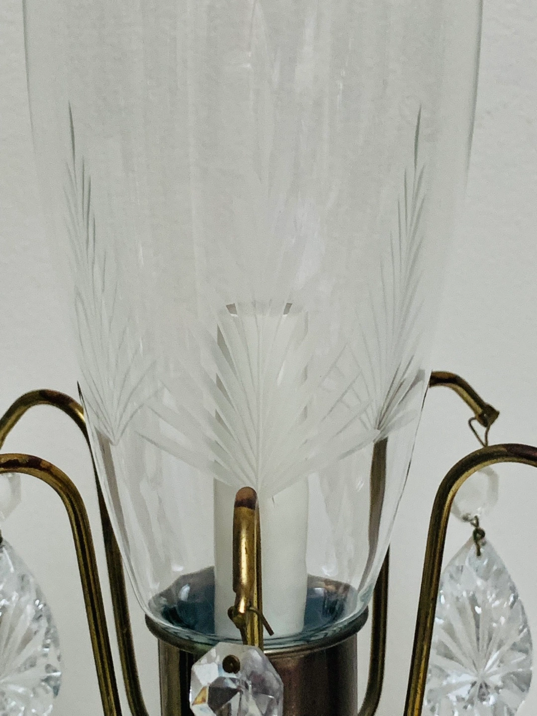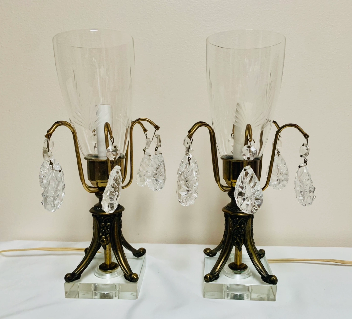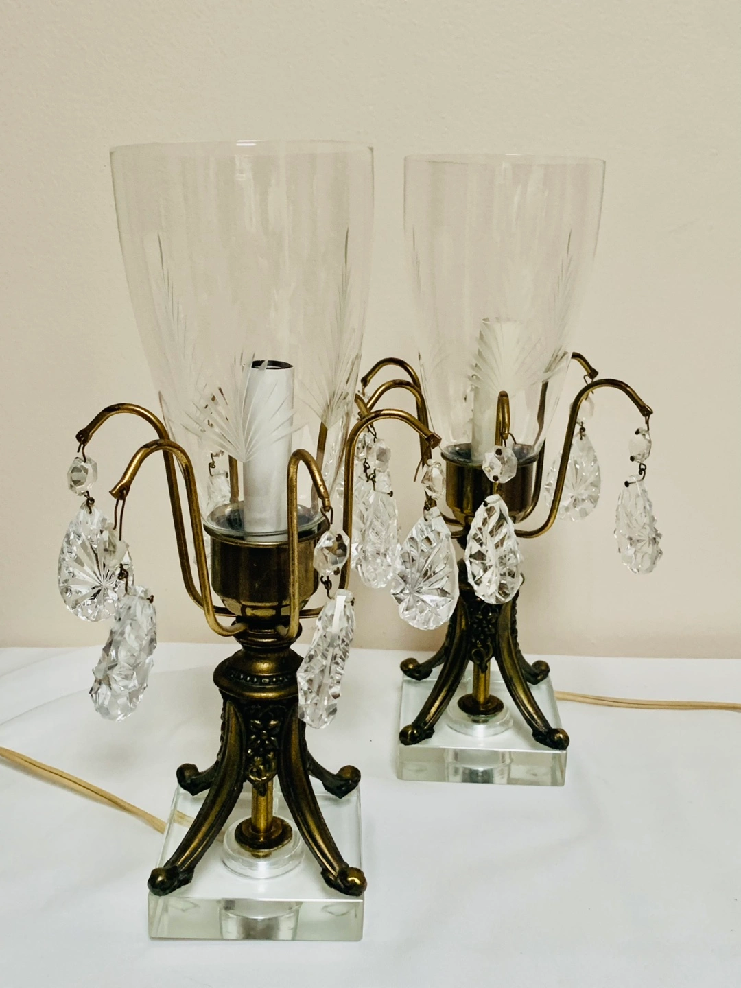 This pair of Hollywood Regency boudoir lamps are in lovely condition. Standing 12 inches tall with original crystals. Would look amazing in a bedroom or even in the living room to give a gentle light.