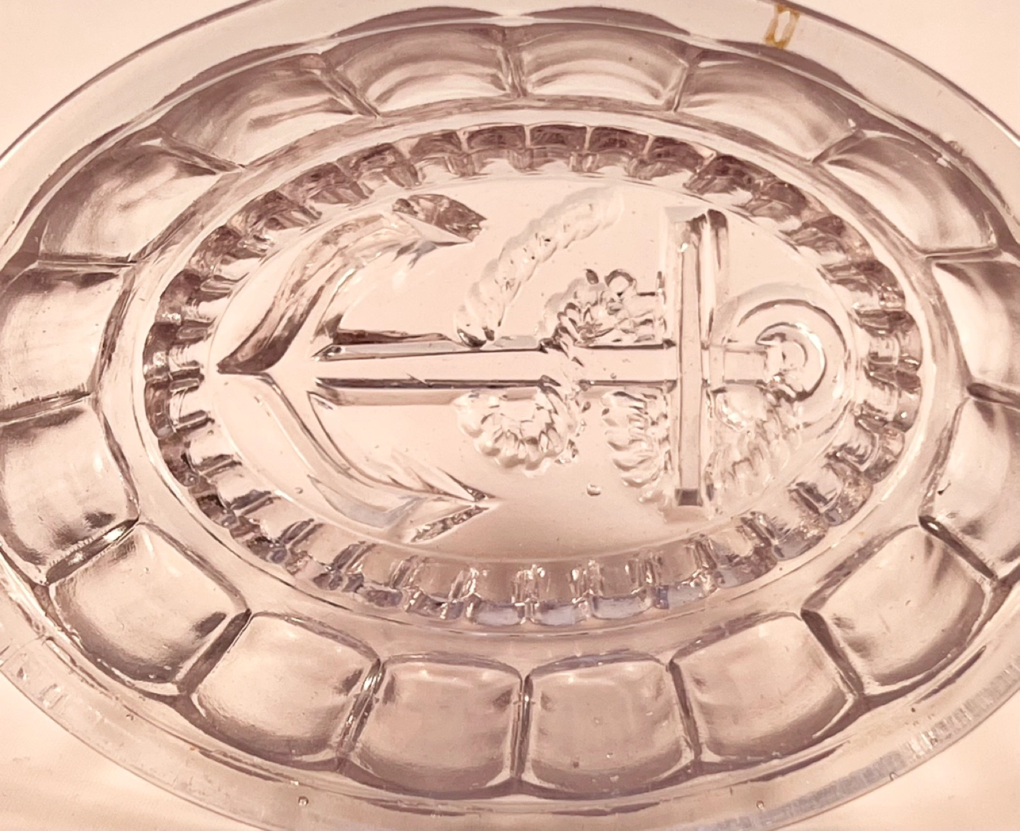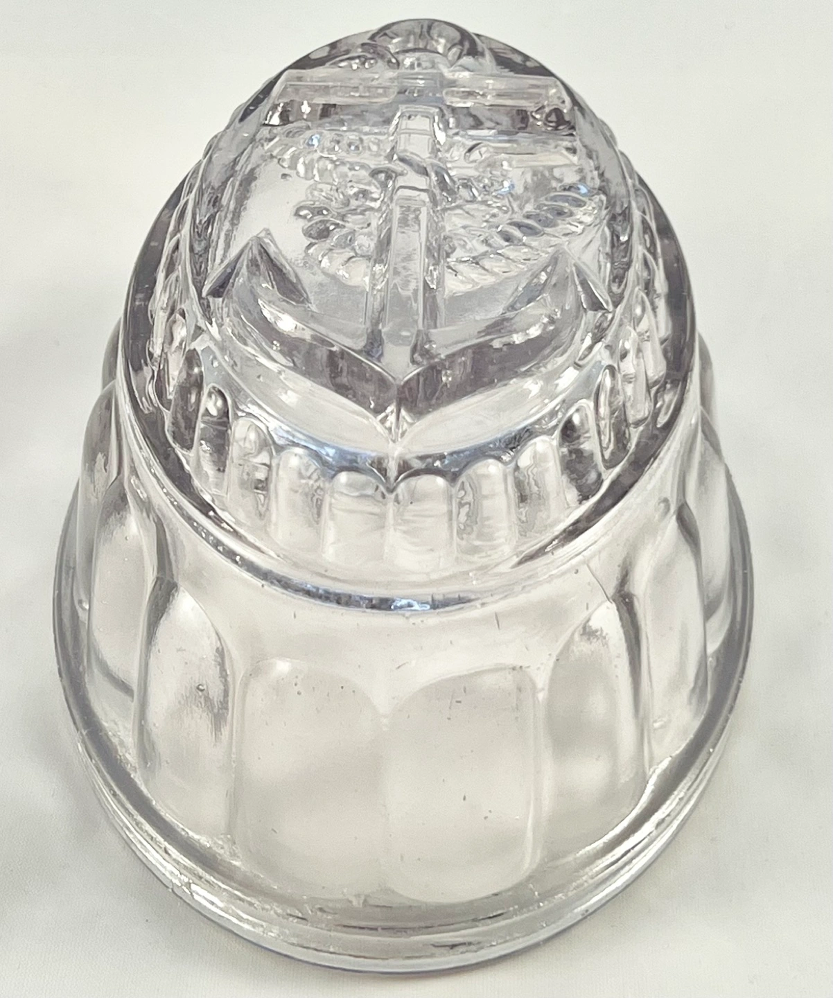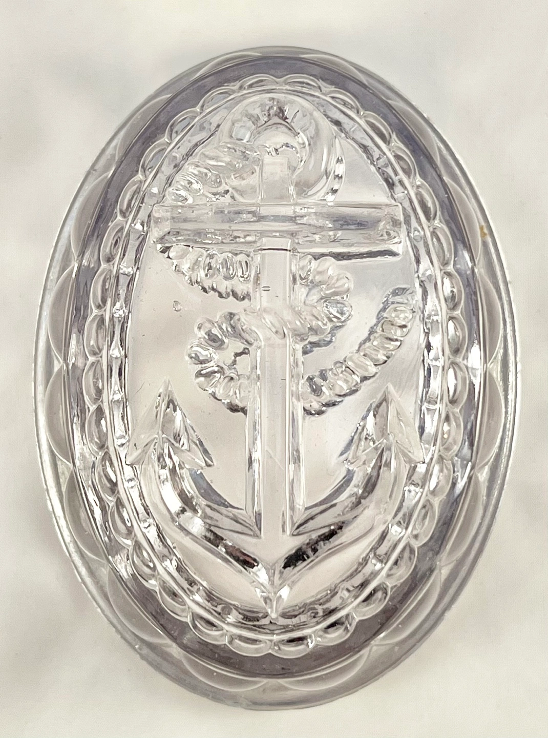 Beautiful vintage glass jelly mold. Features an intricately detailed anchor design. Oval shape. Perfect for adding a touch of nostalgia to your kitchen.