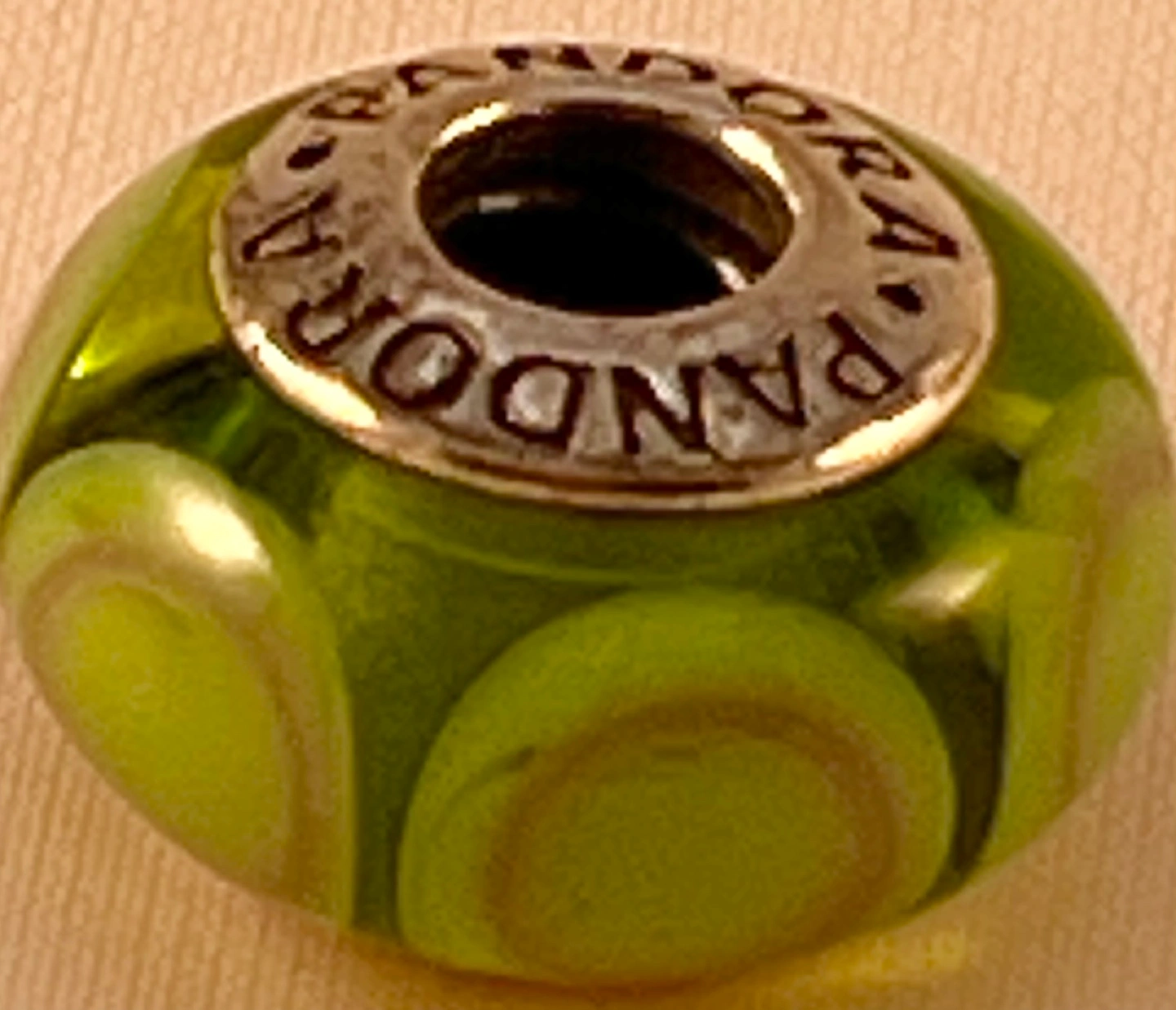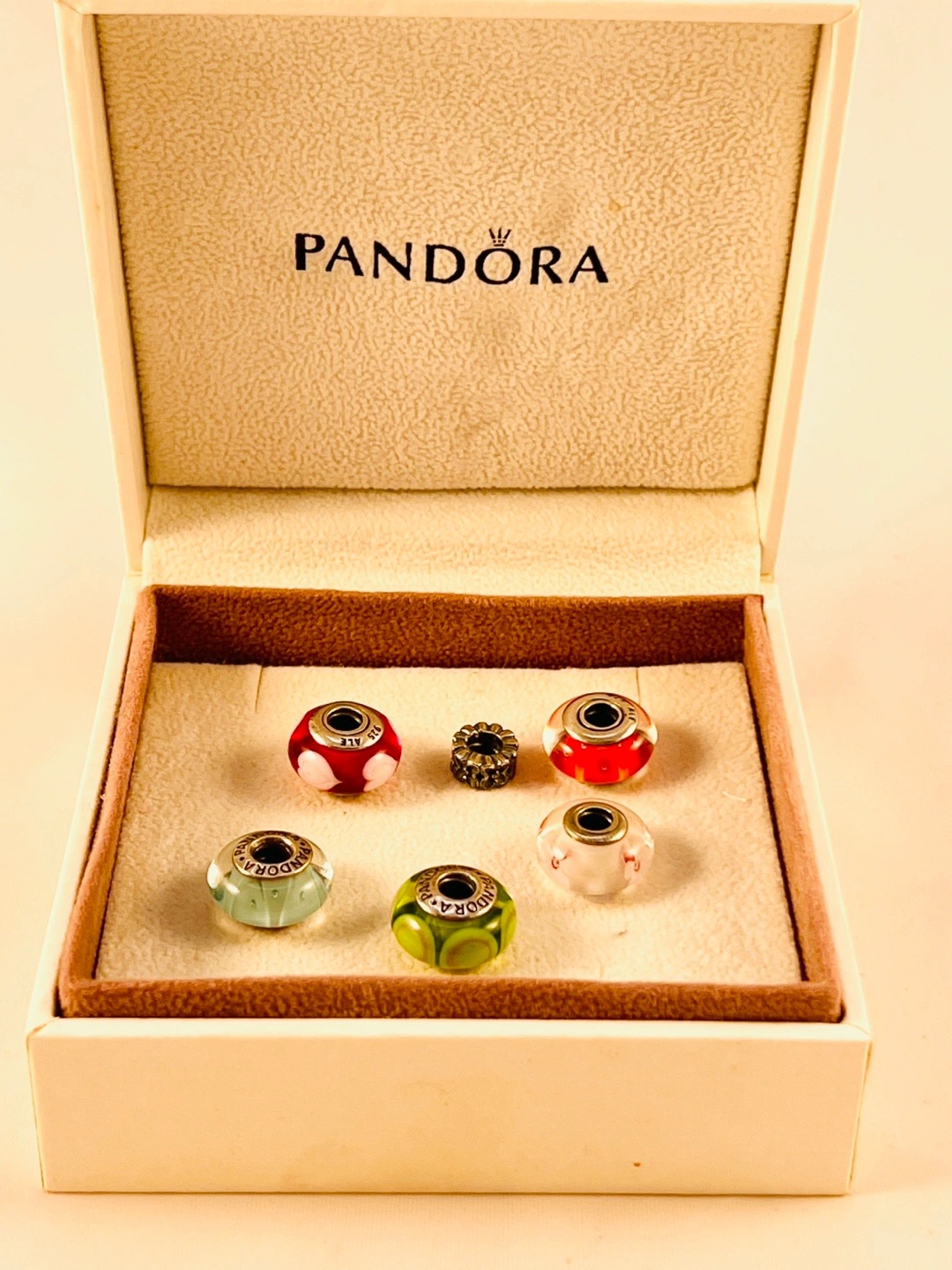 Set of six Pandora Murano glass beads. Various colours and designs. Includes one silver spacer. Authentic Pandora. Stored in original Pandora box.