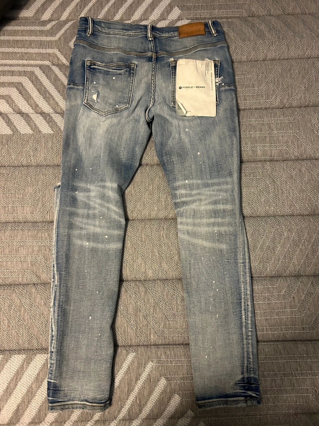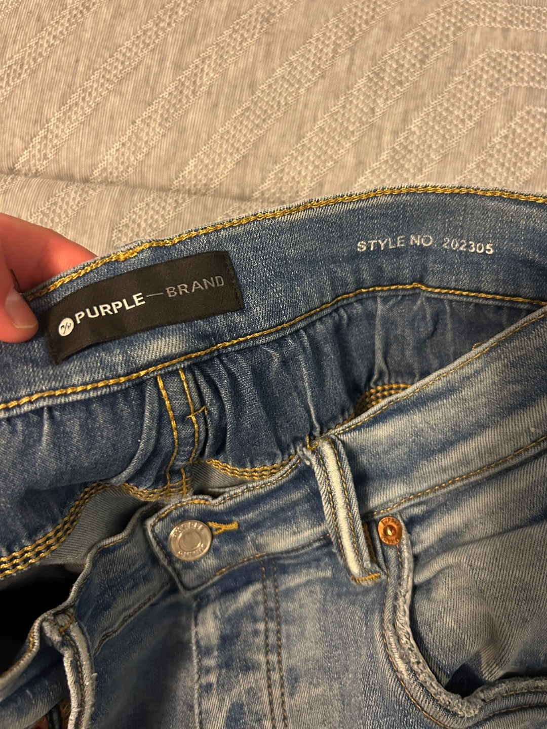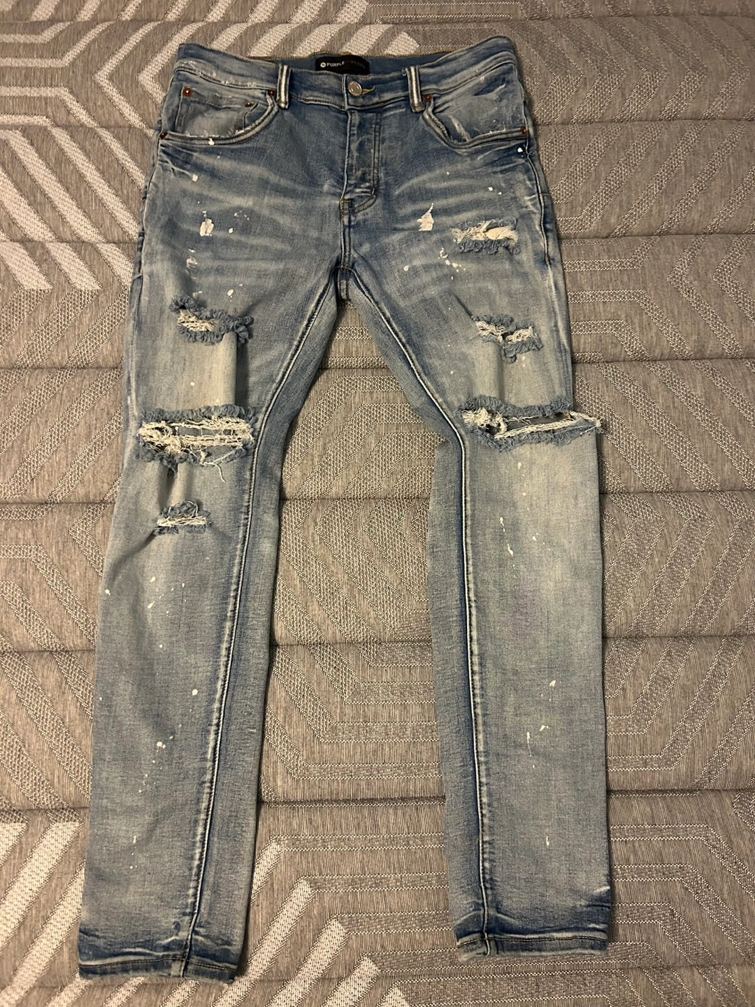 126Men's light wash jeans. Distressed detailing throughout. Skinny fit. Size not specified. Style No. 202305