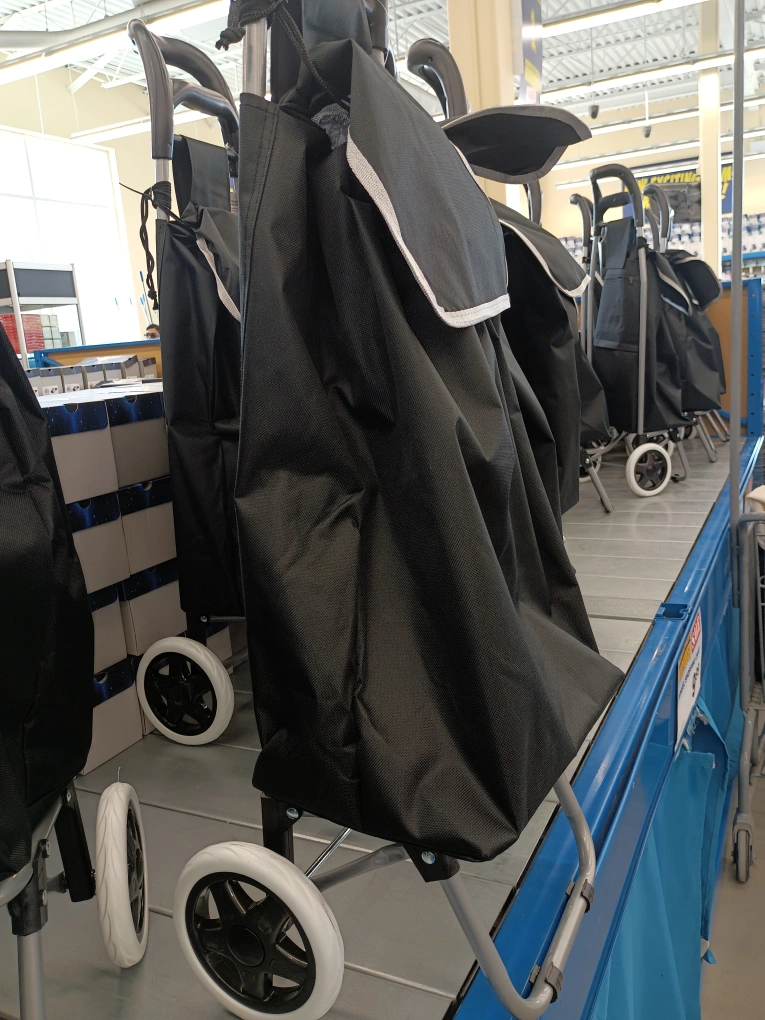 Black fabric shopping cart. Collapsible design. Durable construction. Great for groceries or errands.