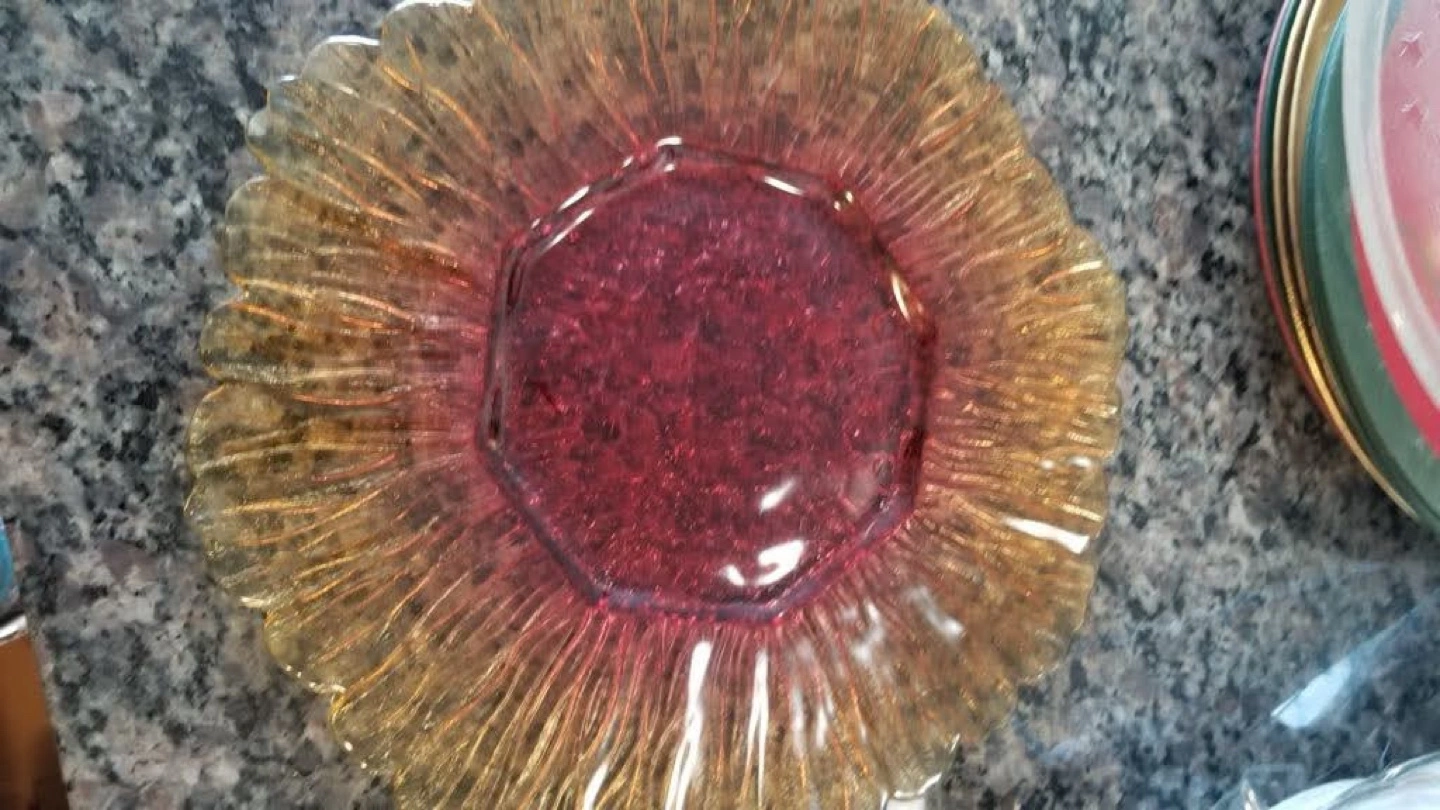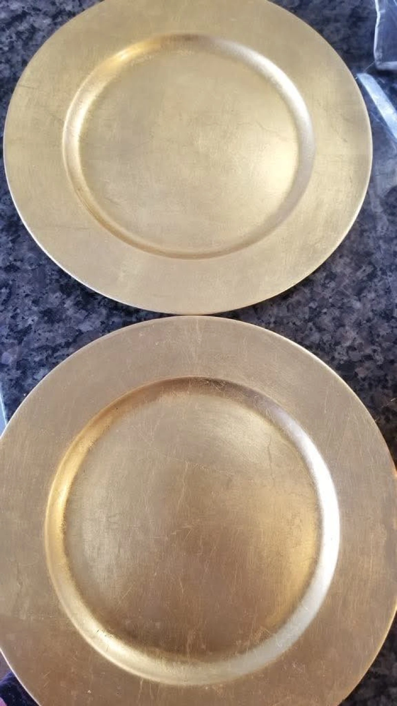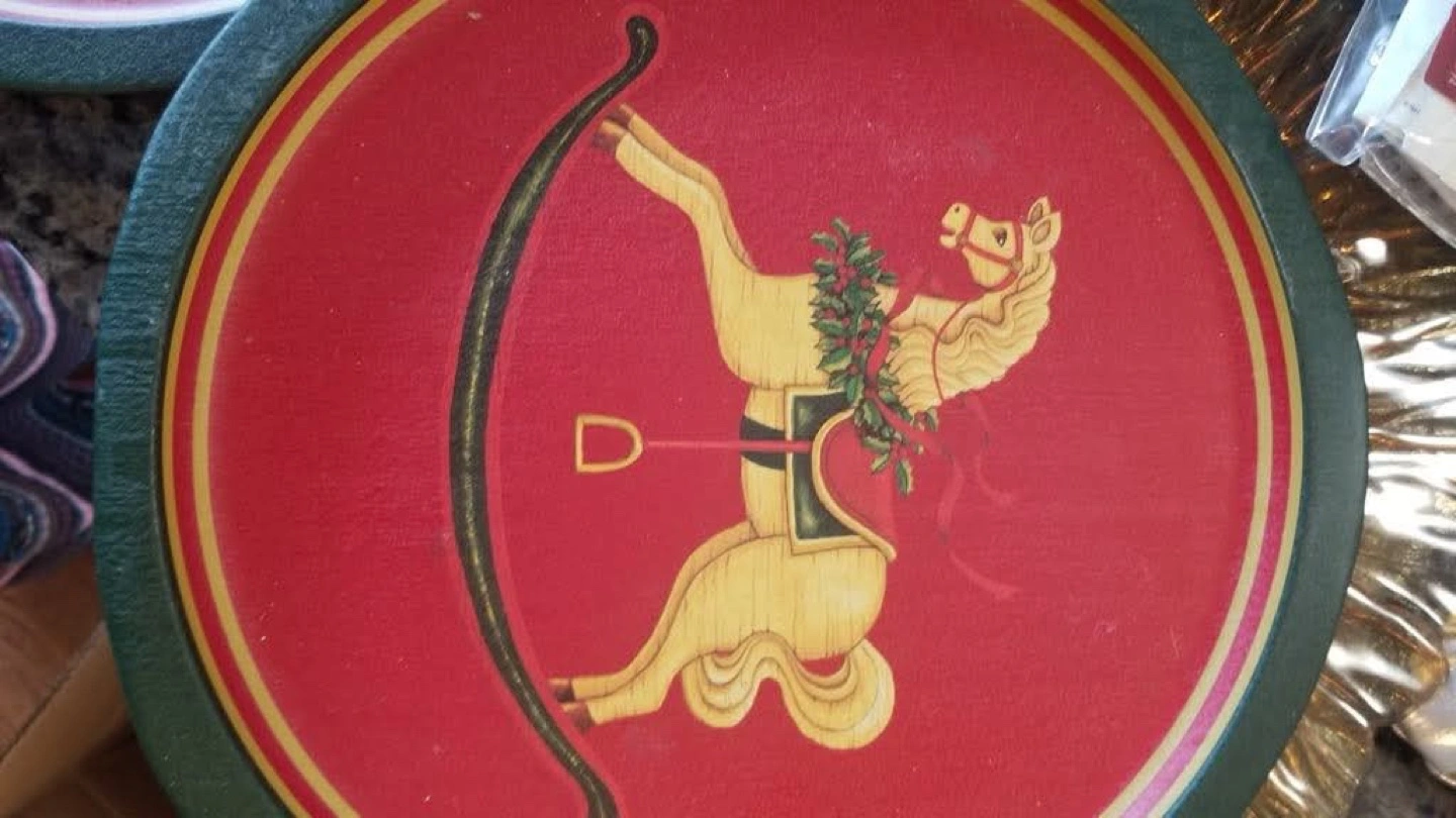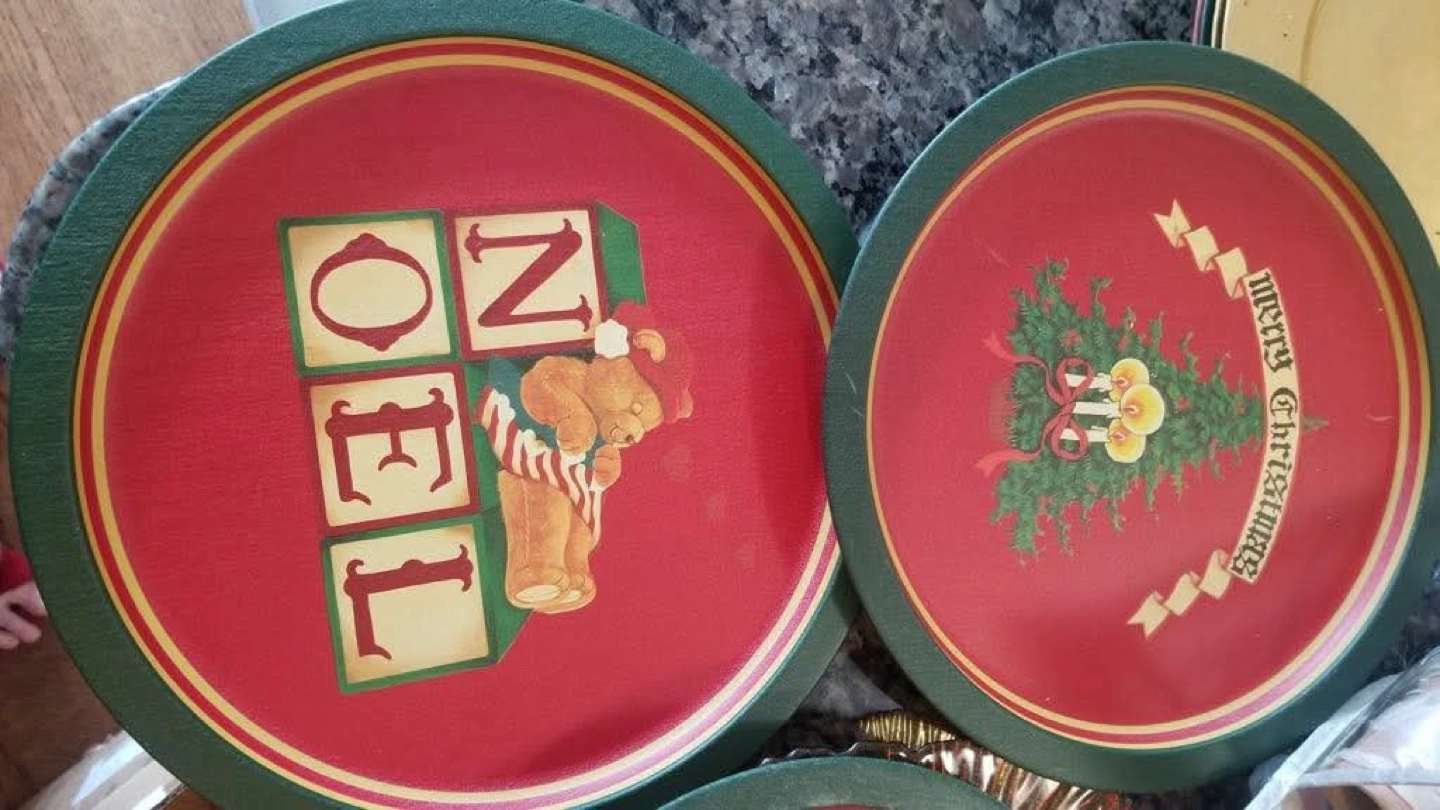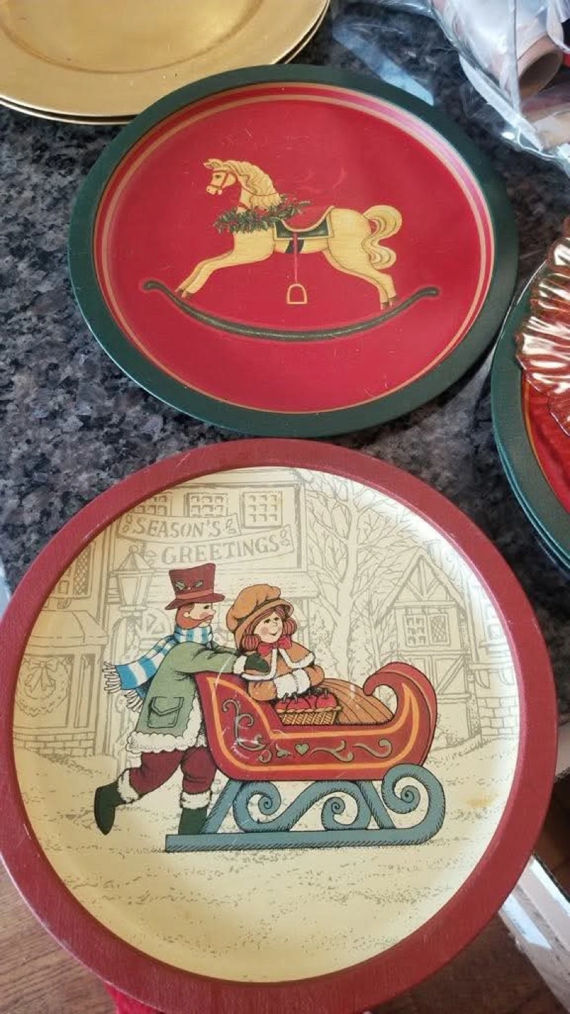 Seven decorative plates. Five feature Christmas designs; two feature a rocking horse, children in a sleigh, teddy bear and Christmas tree. Two are gold charger plates. One is a unique floral design in amber and burgundy glass. Great for holiday decorating or adding a touch of vintage charm to your home. Barely used if at all.