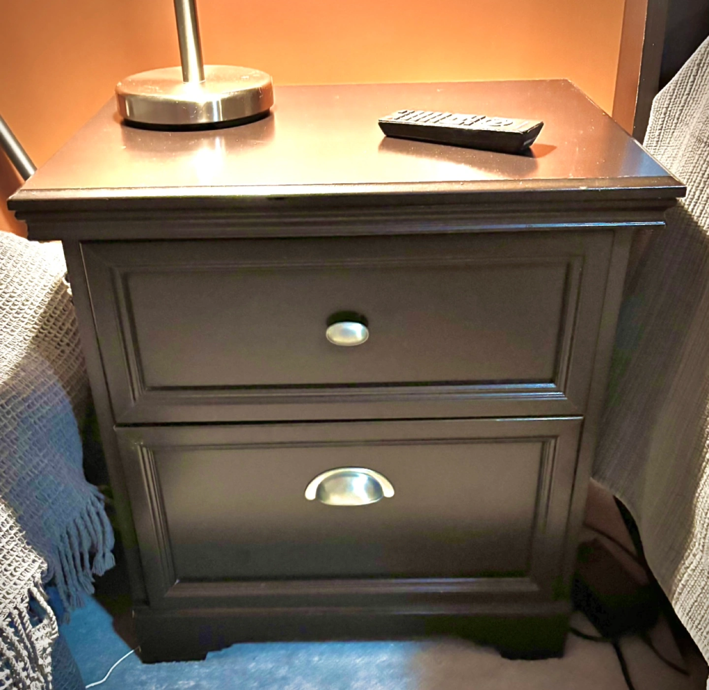 Priced for quick pick up. Two-drawer nightstand. Dark brown finish. One drawer and a small cupboard door. Silver-toned cup knobs.