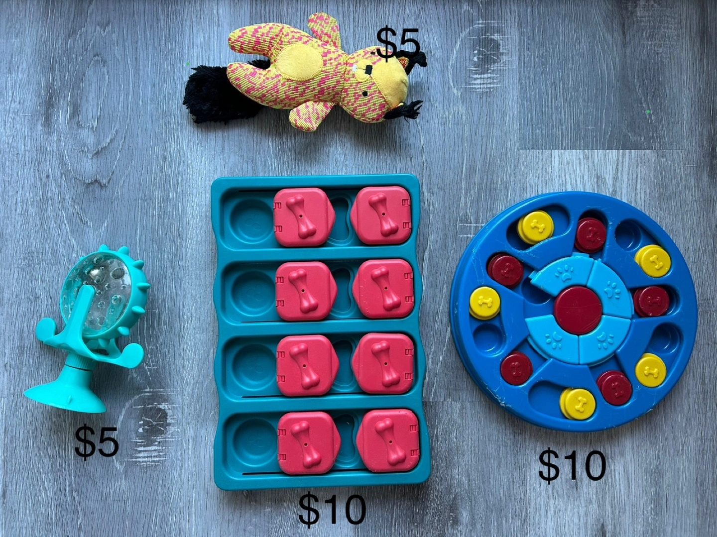 Three dog toys for sale. One plush toy, one treat puzzle, and one IQ treat ball. Good condition. Please refer to the photo for price info.