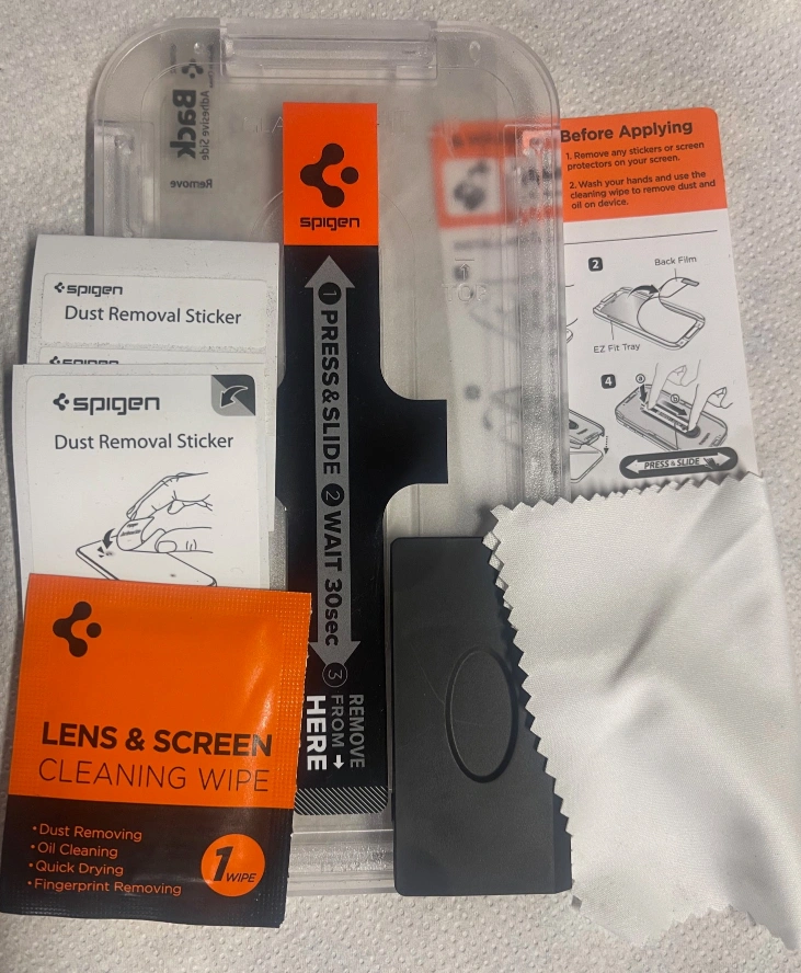 Current glass screen protector is cracked, but am including another one unit spigen easy install glass screen protector, standard type (not privacy) with it, also pictured. Another glass camera protector unit not included.