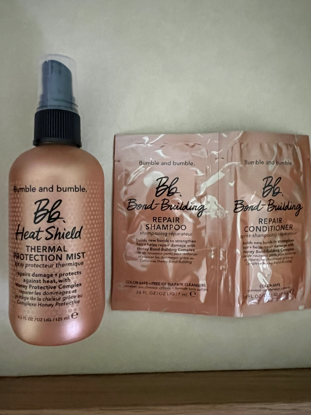 New Bumble and Bumble hair care products. Includes travel-size Bond-Building Repair Shampoo and Conditioner and a full-size Heat Shield Thermal Protection Mist. Protects against heat damage. Repairs and helps prevent breakage.