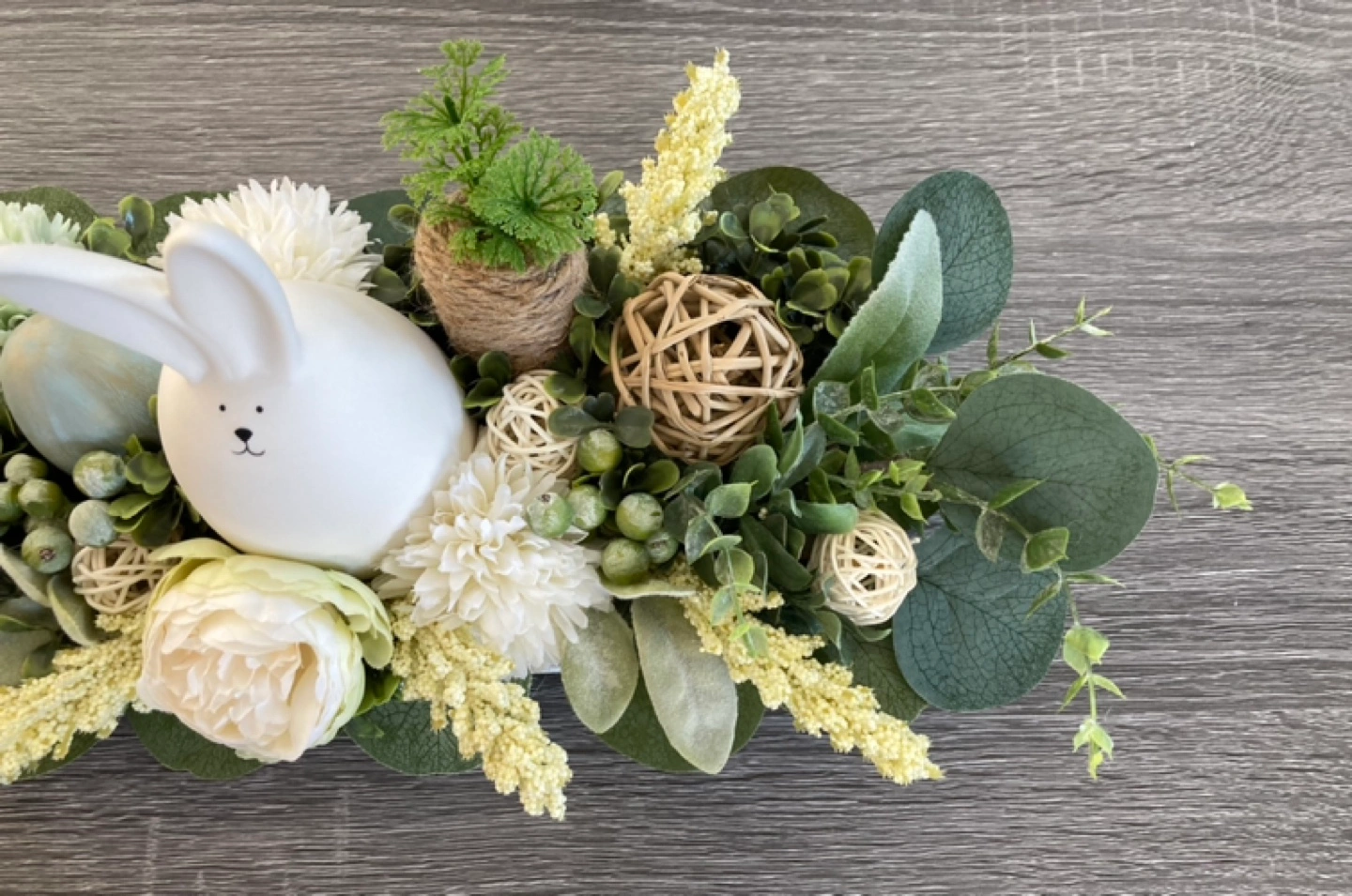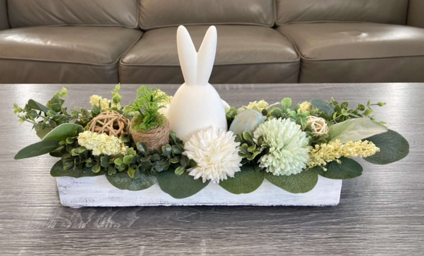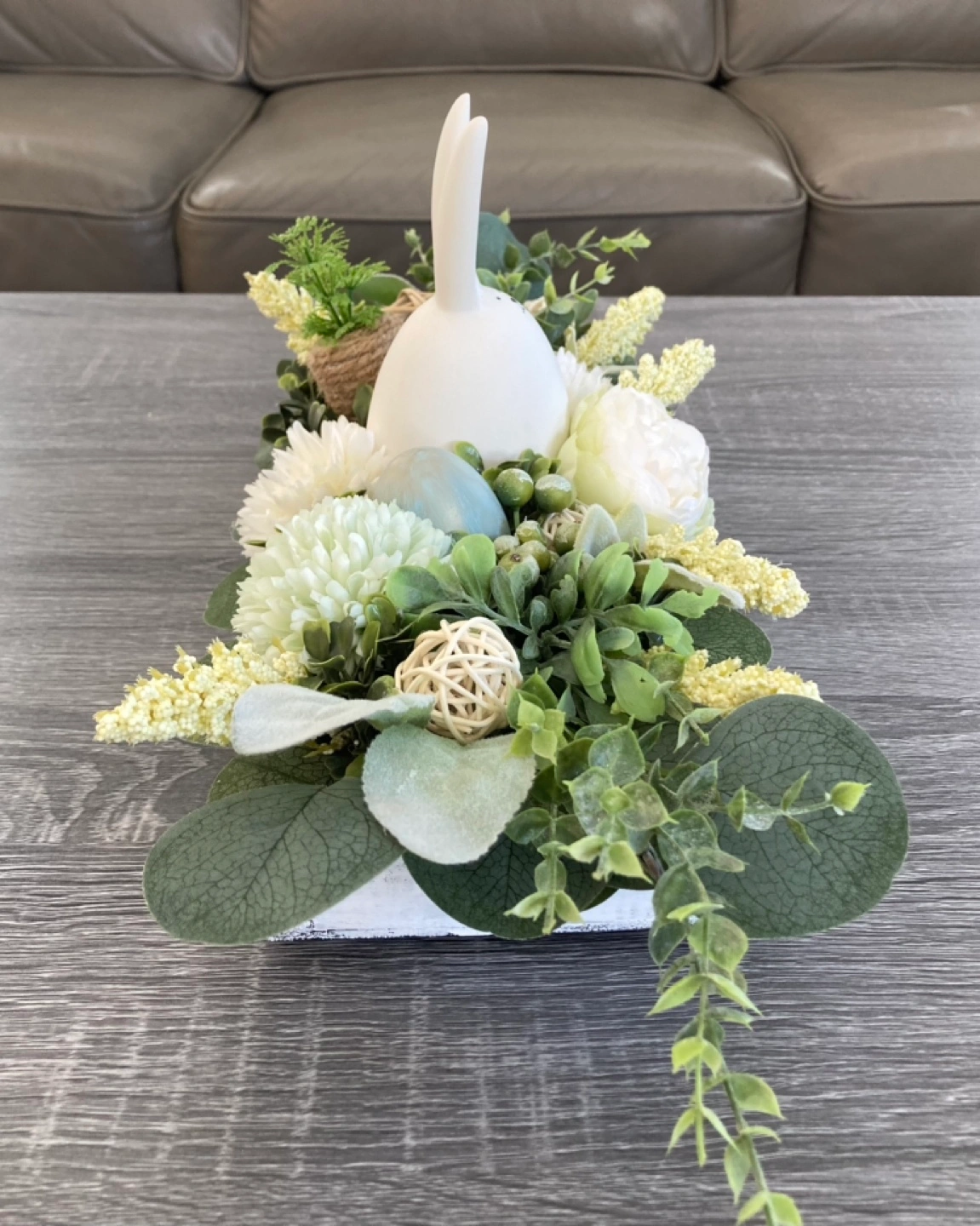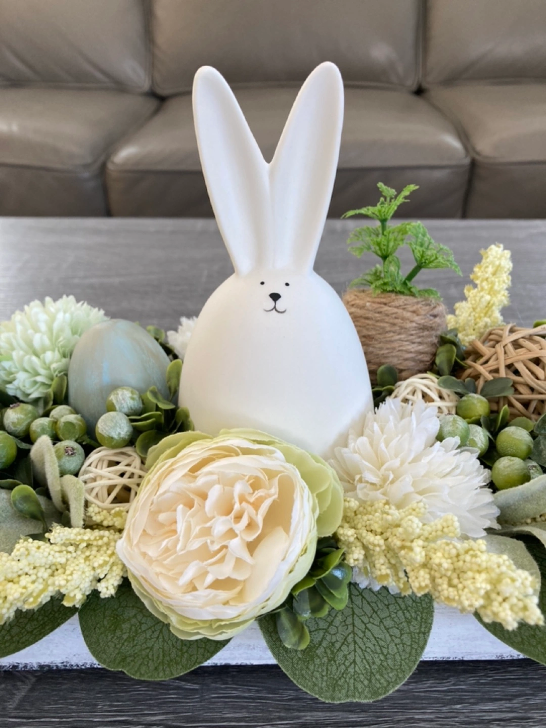 Spring/ Easter Ceramic Bunny Table Centrepiece Overall 7.5” tall by 15” wide by 5.5” deep Base 11.5” wide by 4.5” deep Rustic white base holds ceramic bunny, egg, twine carrot, artificial flowers, leaves, and twig balls. Please follow the link below for more. Thanks. Facebook page: Artizanna https://www.facebook.com/profile.php?id=100073692274142 Or Instagram: @artizanna__