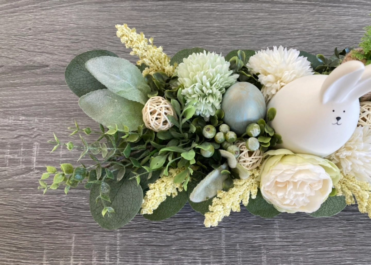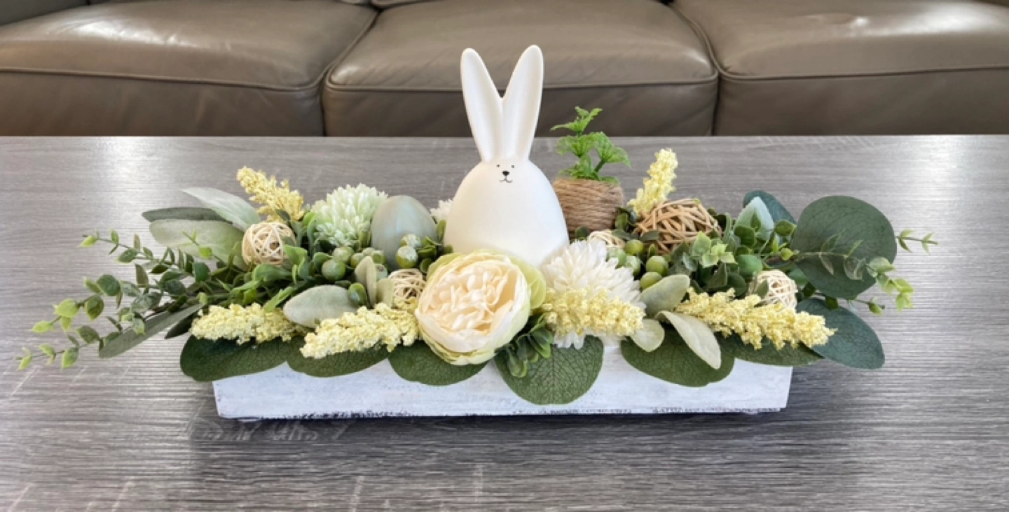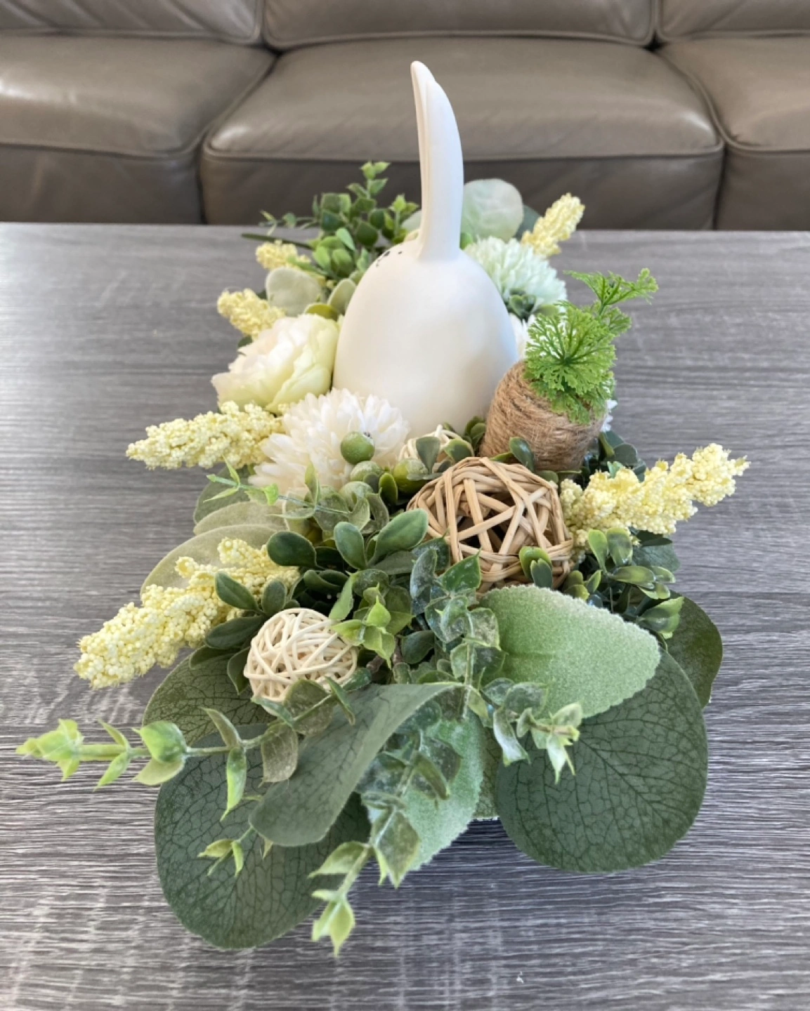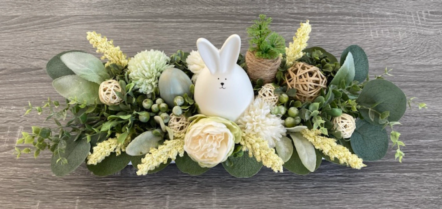 Spring/ Easter Ceramic Bunny Table Centrepiece Overall 7.5” tall by 15” wide by 5.5” deep Base 11.5” wide by 4.5” deep Rustic white base holds ceramic bunny, egg, twine carrot, artificial flowers, leaves, and twig balls. Please follow the link below for more. Thanks. Facebook page: Artizanna https://www.facebook.com/profile.php?id=100073692274142 Or Instagram: @artizanna__