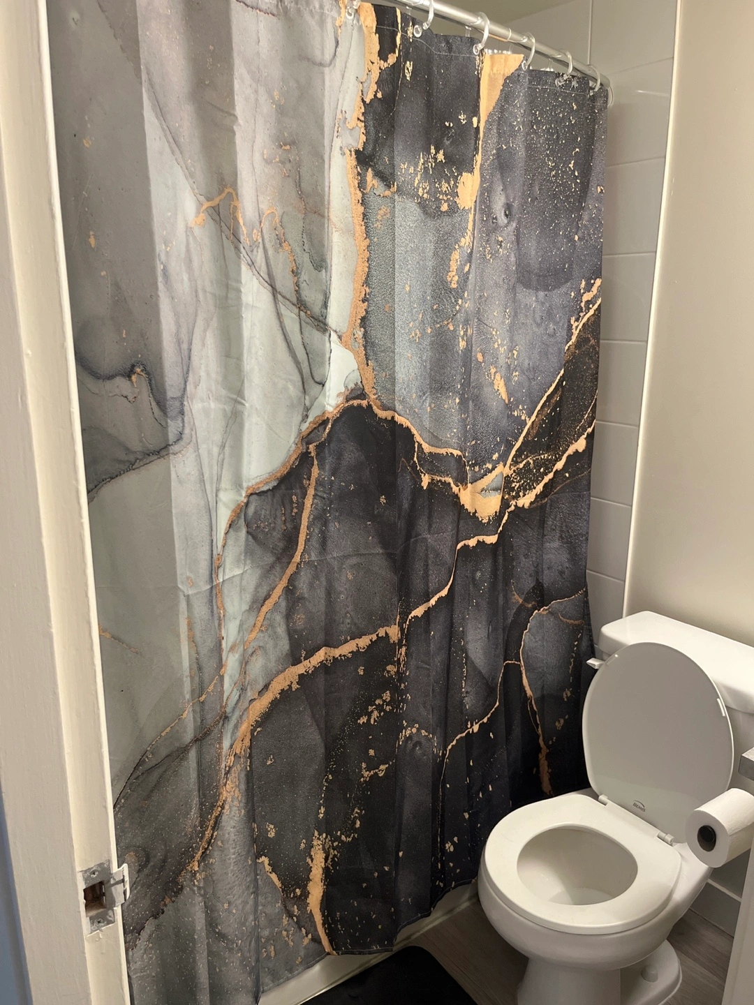 Stylish shower curtain. Features a marble design in shades of grey, black, and gold. Waterproof fabric. Adds a touch of luxury to your bathroom.
