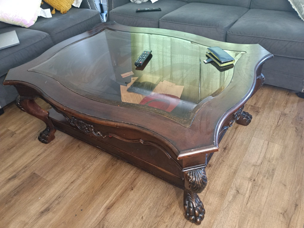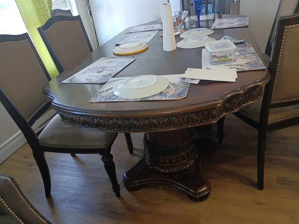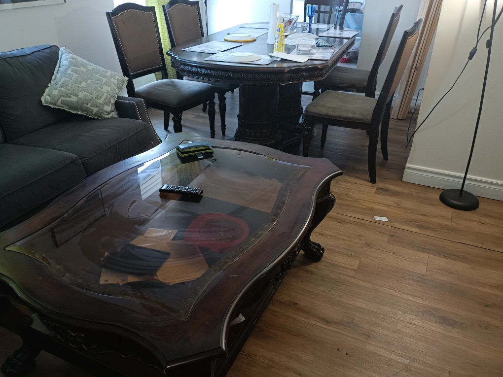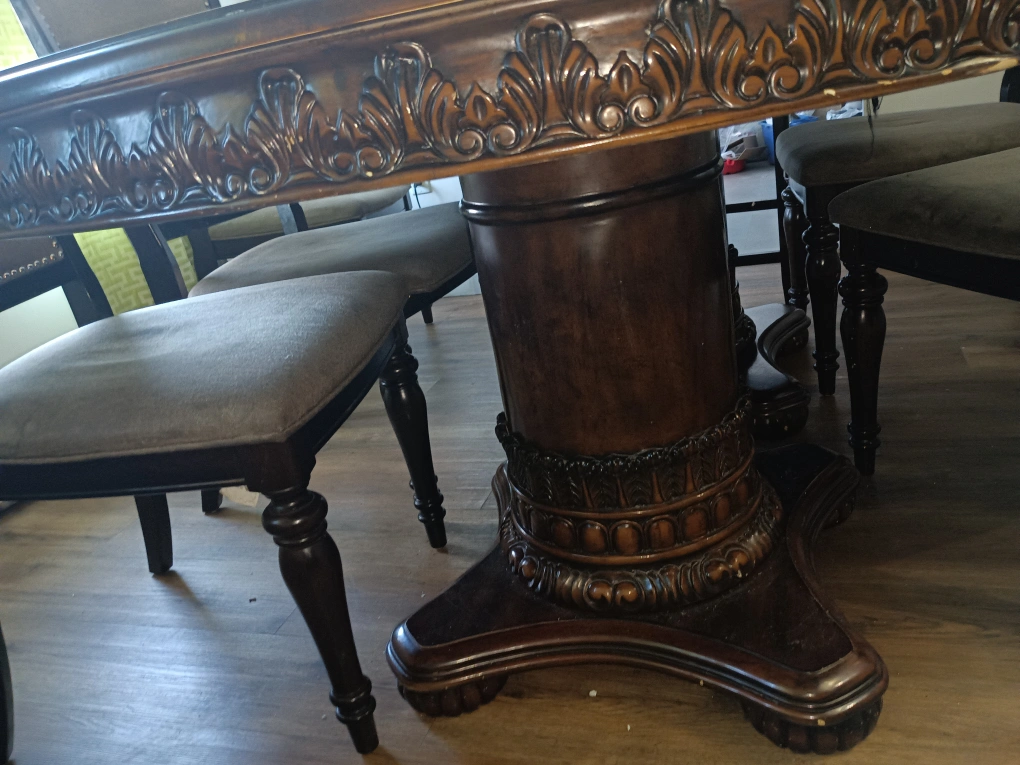 20Beautiful dark brown wood dining set. Includes oval table and six chairs. Matching coffee table features glass top. Ornate carvings. Some minor wear and tear. we are moving to a small space the dining table is extendable can be sale separate
