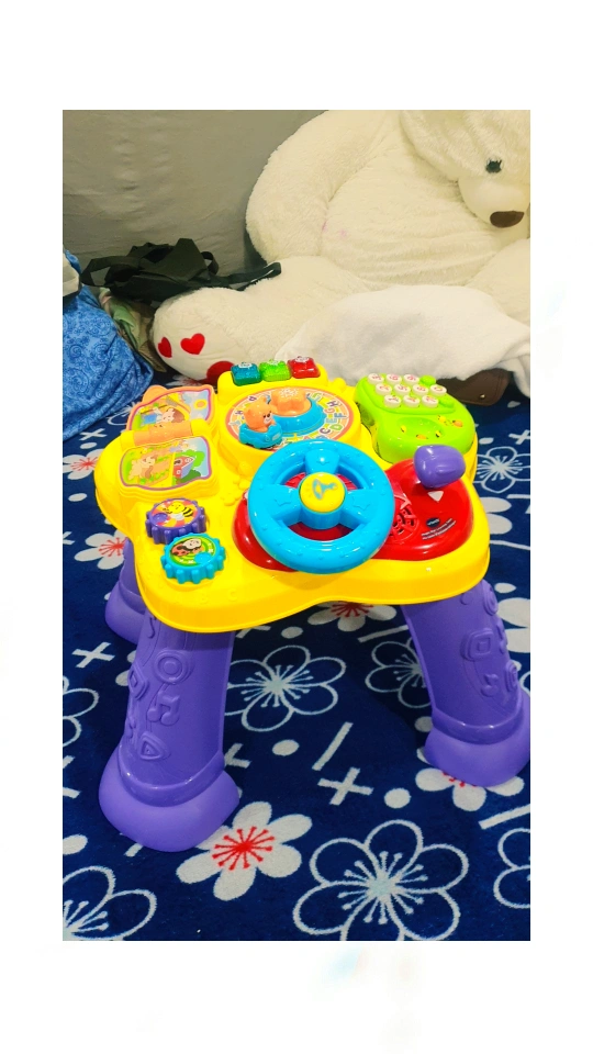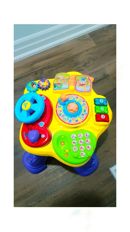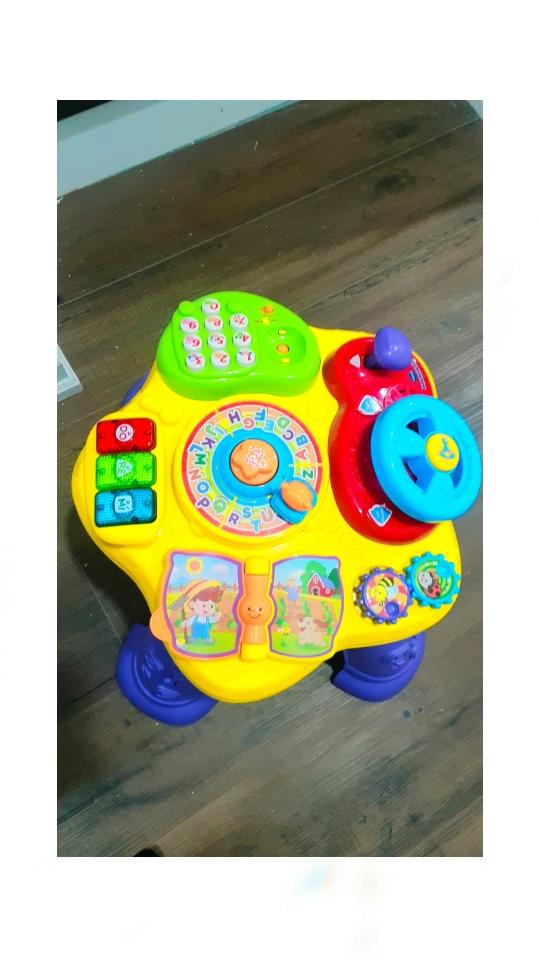 Multi-activity learning centre. Features include alphabet, numbers, steering wheel, and more. Great for toddlers. Purple legs, yellow top.