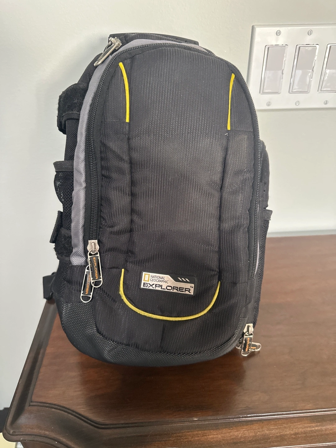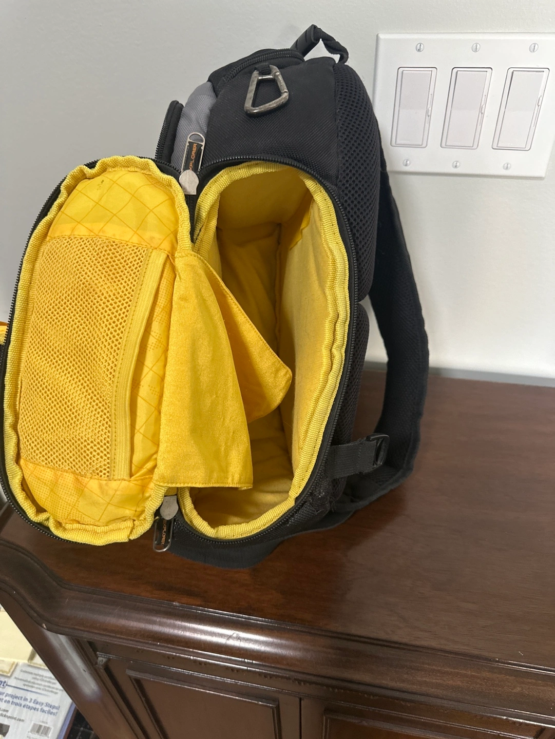 Black and yellow camera backpack. Multiple compartments and pockets. Adjustable straps. Carry handle. Great for travel or everyday use.