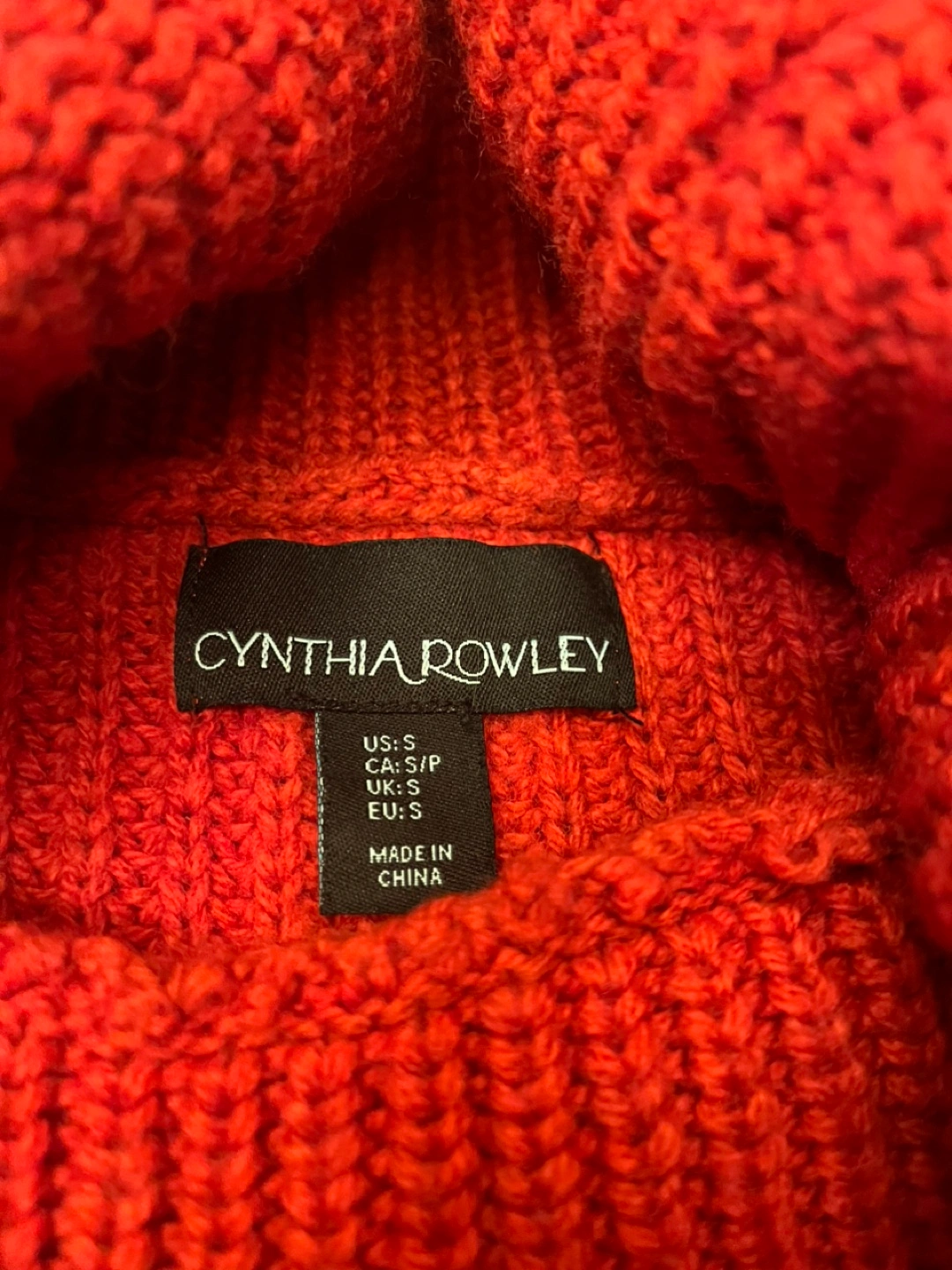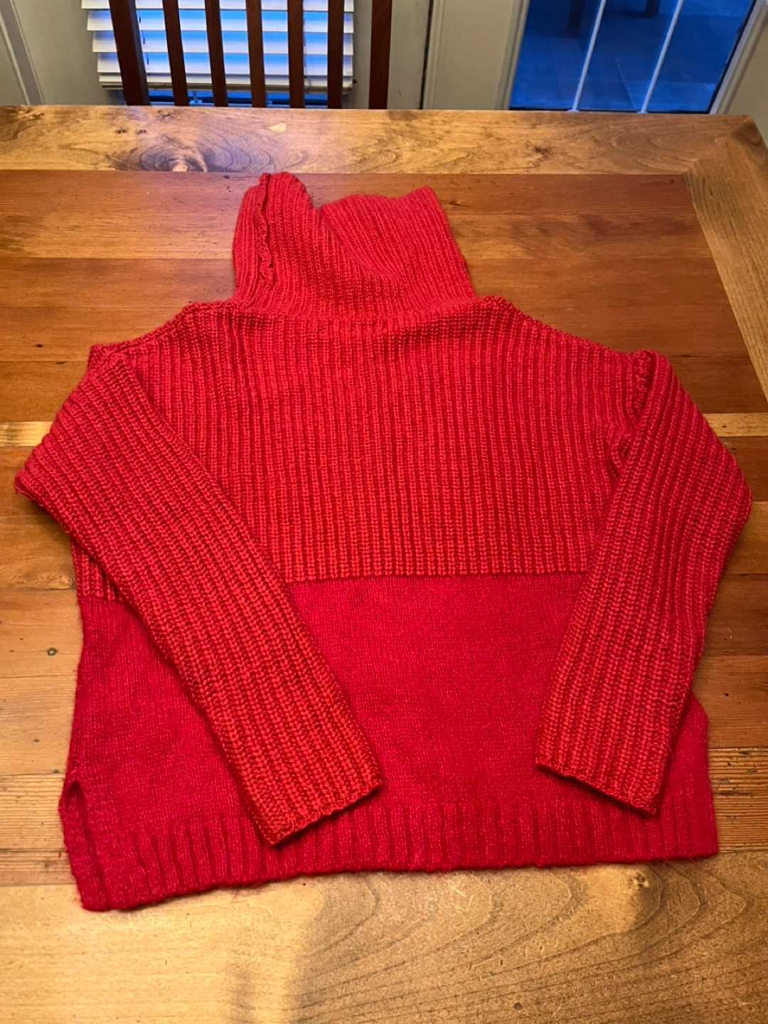 Women's red mock neck sweater with a ribbed texture. Super comfy, not too heavy. It is now too small for me.