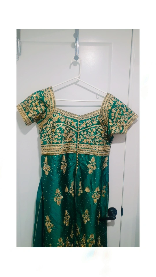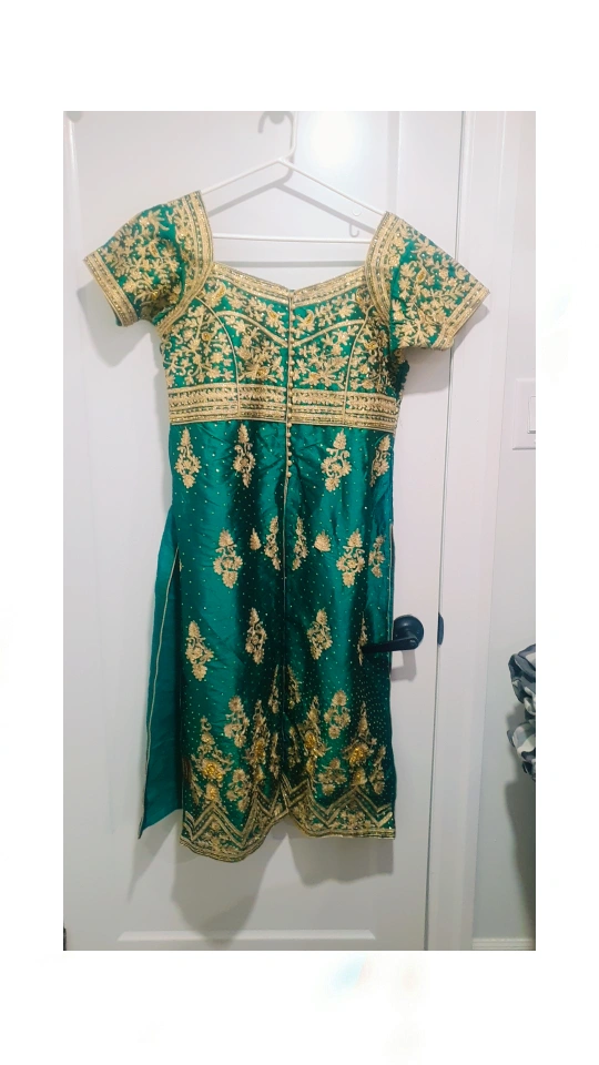 Beautiful teal salwar kameez. Intricate gold embroidery. Matching gold pants. Stunning outfit for special occasions.