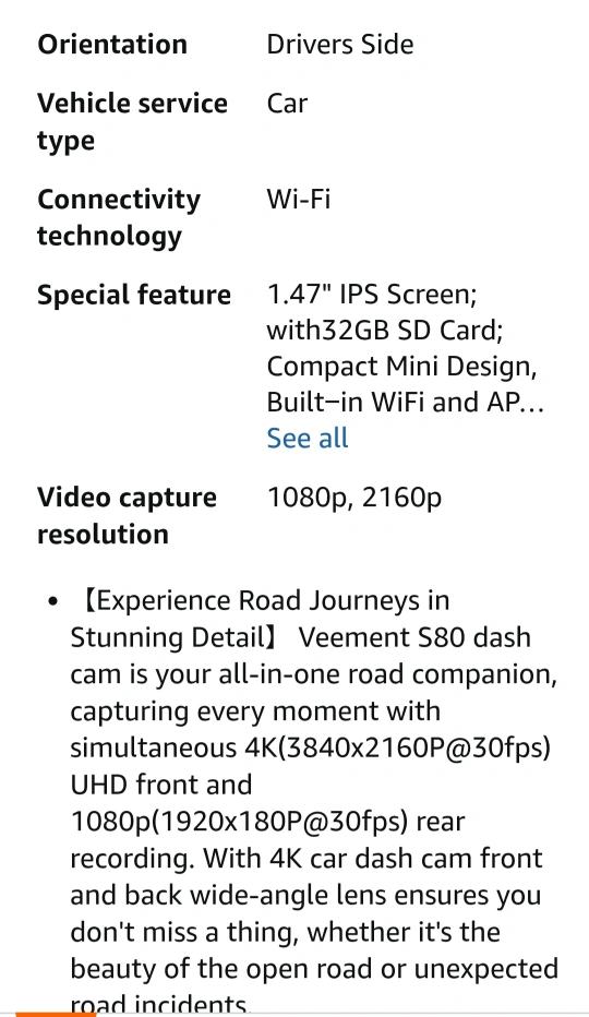 Mini car camera with 1.47" display. 170° wide angle lens. Night vision. 24H parking. G-sensor. Loop recording. Includes 32G card. 4K+1080P. Built-in WiFi.