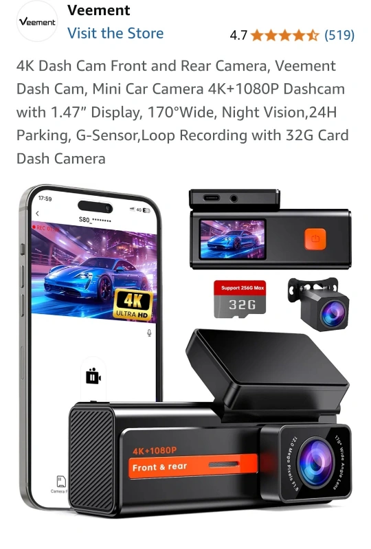 Veement S80 4K Dash Cam - Front and Rear