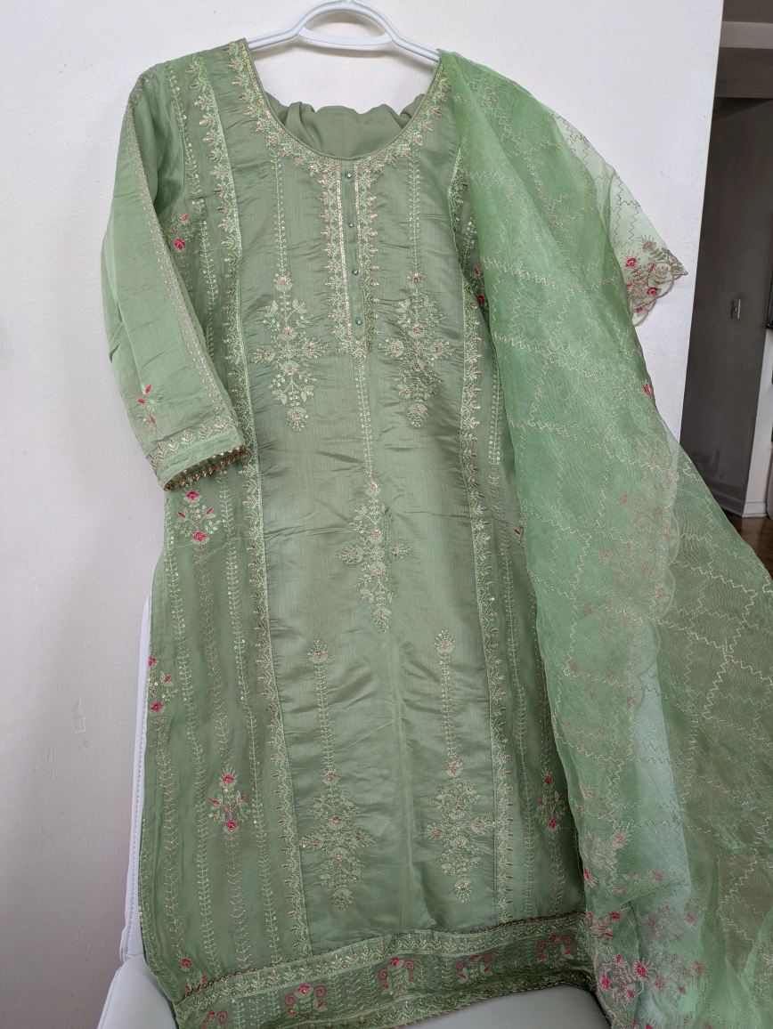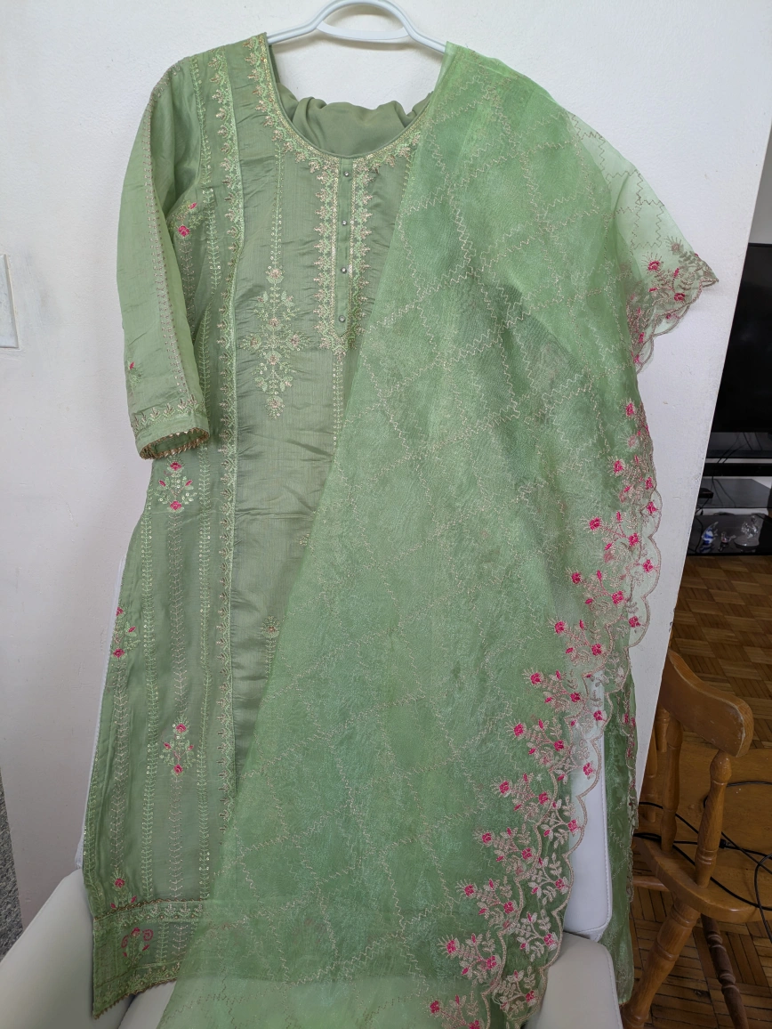 Gorgeous sage green salwar kameez. with three-quarter sleeves. Used only once for few hours
