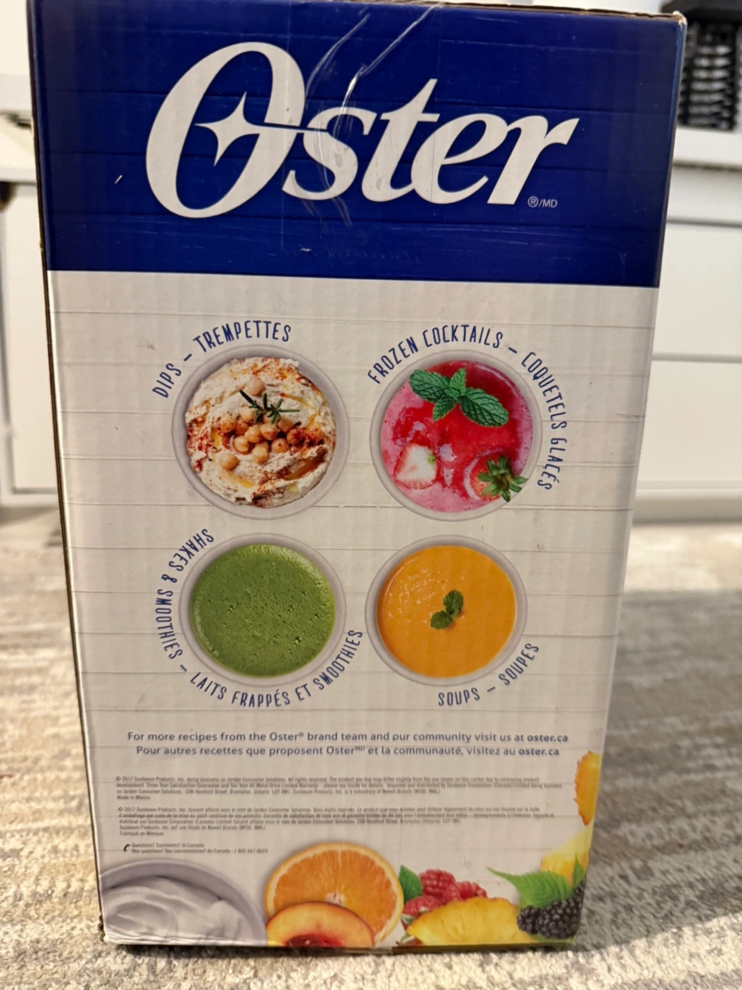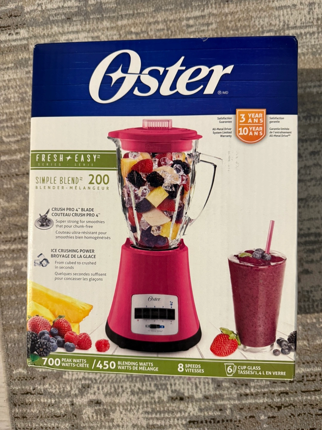 Brand new Oster blender. Pink colour. 700 peak watts/450 blending watts. 8 speeds. 6 cup glass. Crush Pro 4" blade. Ice crushing power. Makes smoothies, soups, dips.