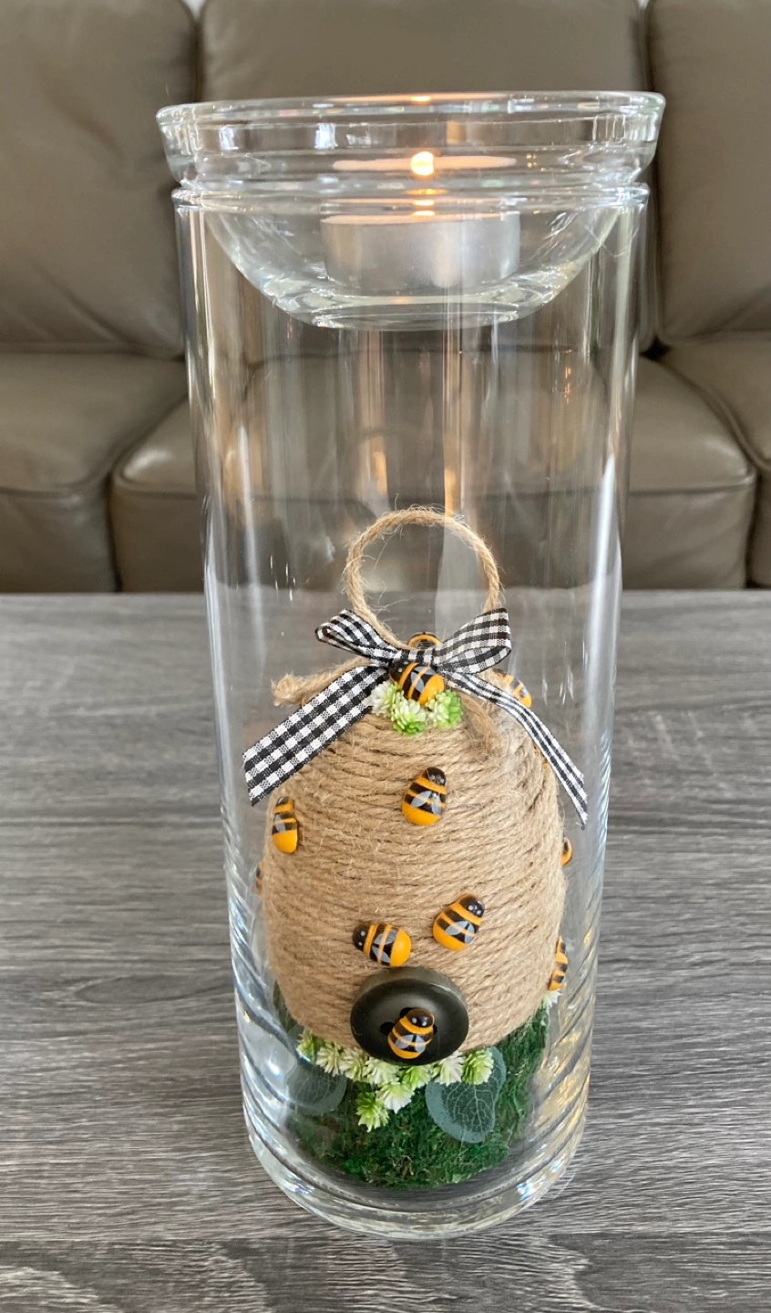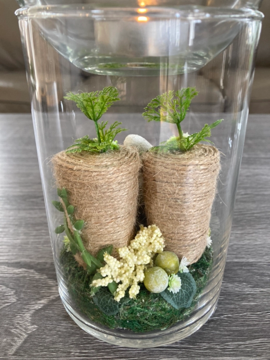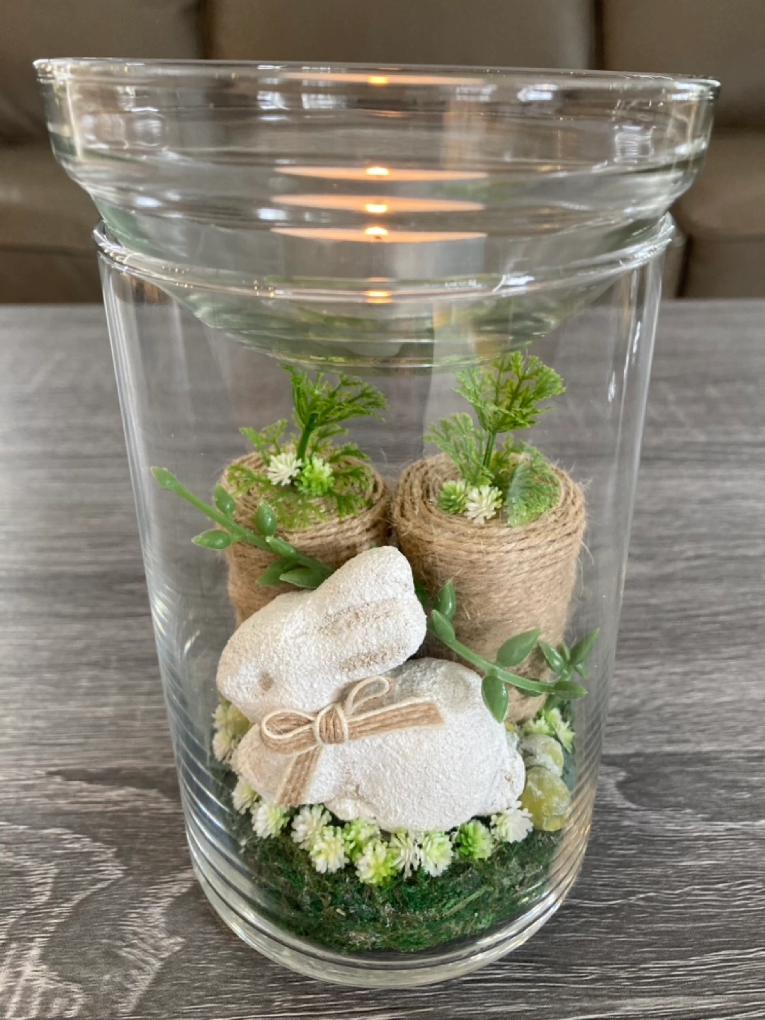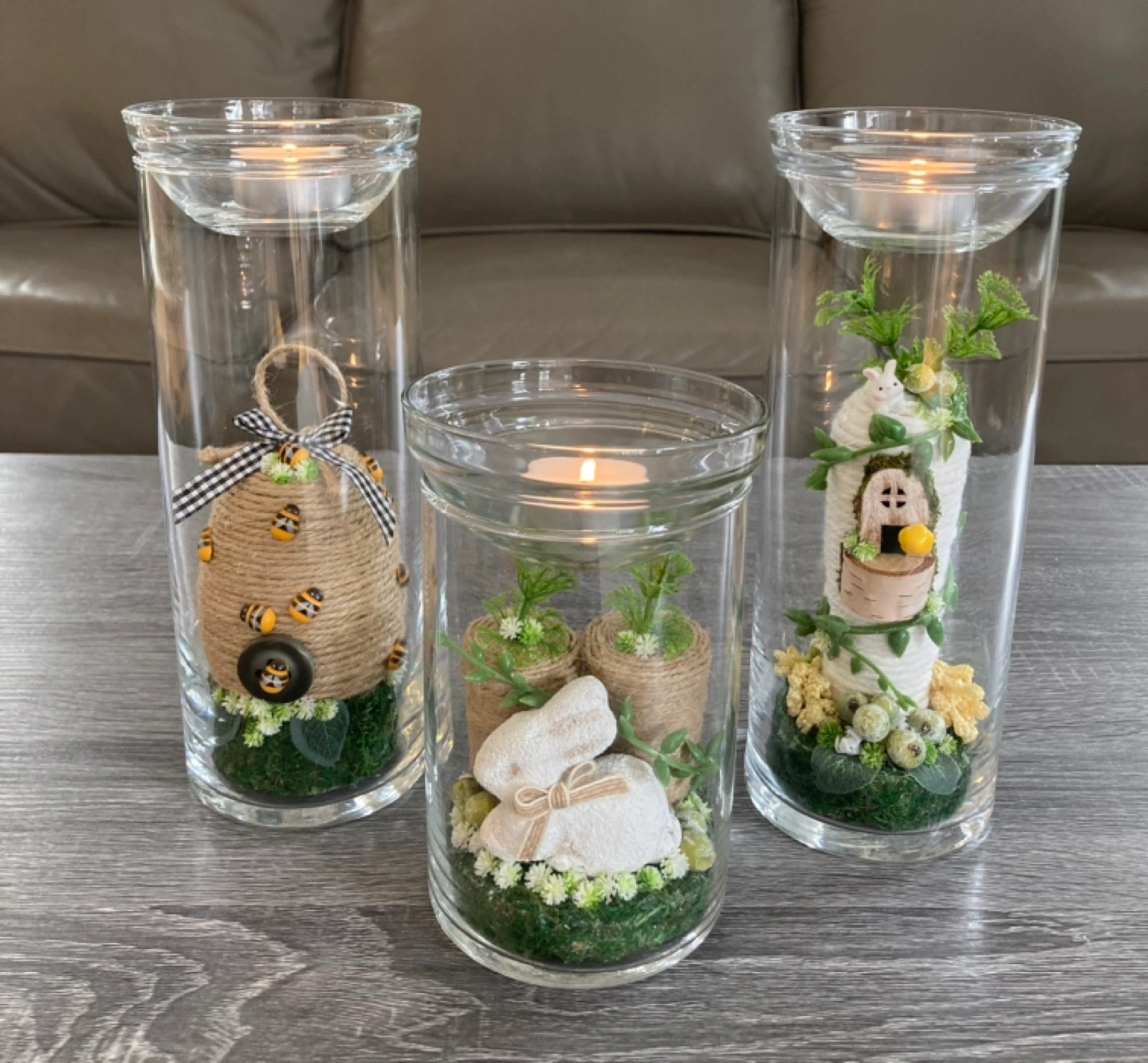 $20 each or all for $50 🐇Spring/ Easter Themed Glass Candleholder with Bunny Carrot House Approx. 9.5” tall by 3.5” diameter Glass candleholder with removable glass insert, hold a carrot house made of white rope. This cute bunny’s home features a doorway with a mini mushroom door handle and birch slice ledge and is surrounded by artificial flowers, greenery, berries with green moss base. Short Spring/Easter Themed Glass Candleholder with Bunny Approx. 6 1/2” tall by 3 3/4” diameter Glass candleholder with removable glass insert, holds twine carrots, bunny, moss base, artificial berries, and flowers. Spring Themed Glass Candleholder with Beehive Approx. 9.5” tall by 3.5” diameter Glass candleholder with removable glass insert holds a jute wrapped beehive with mini wood bees, moss base and artificial flowers and greenery. Please follow the link below for more. Thanks. Facebook page: Artizanna https://www.facebook.com/profile.php?id=100073692274142 Or Instagram: @artizanna__