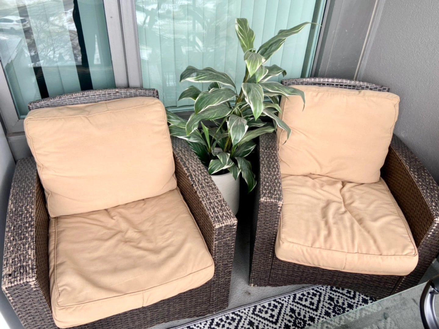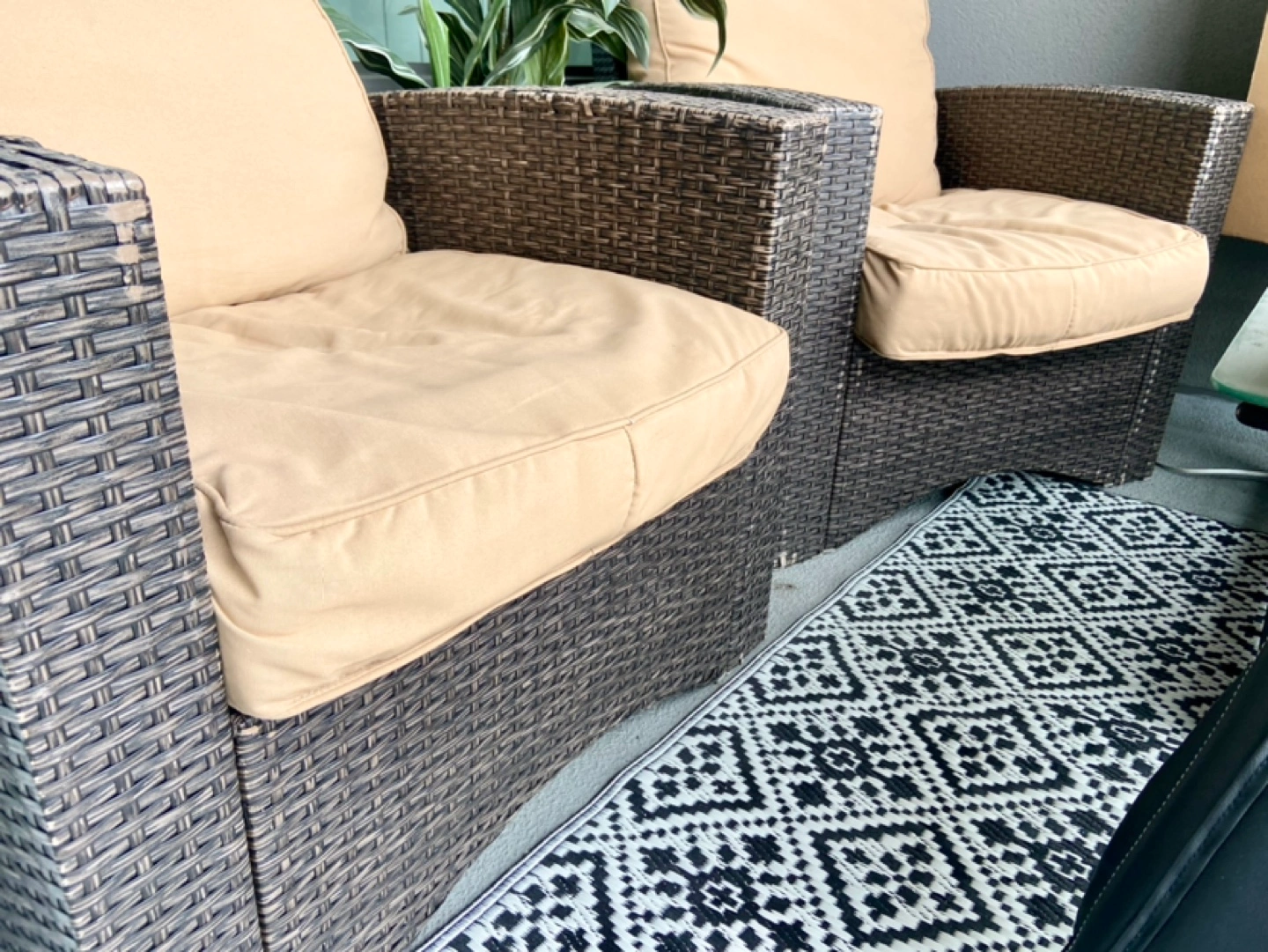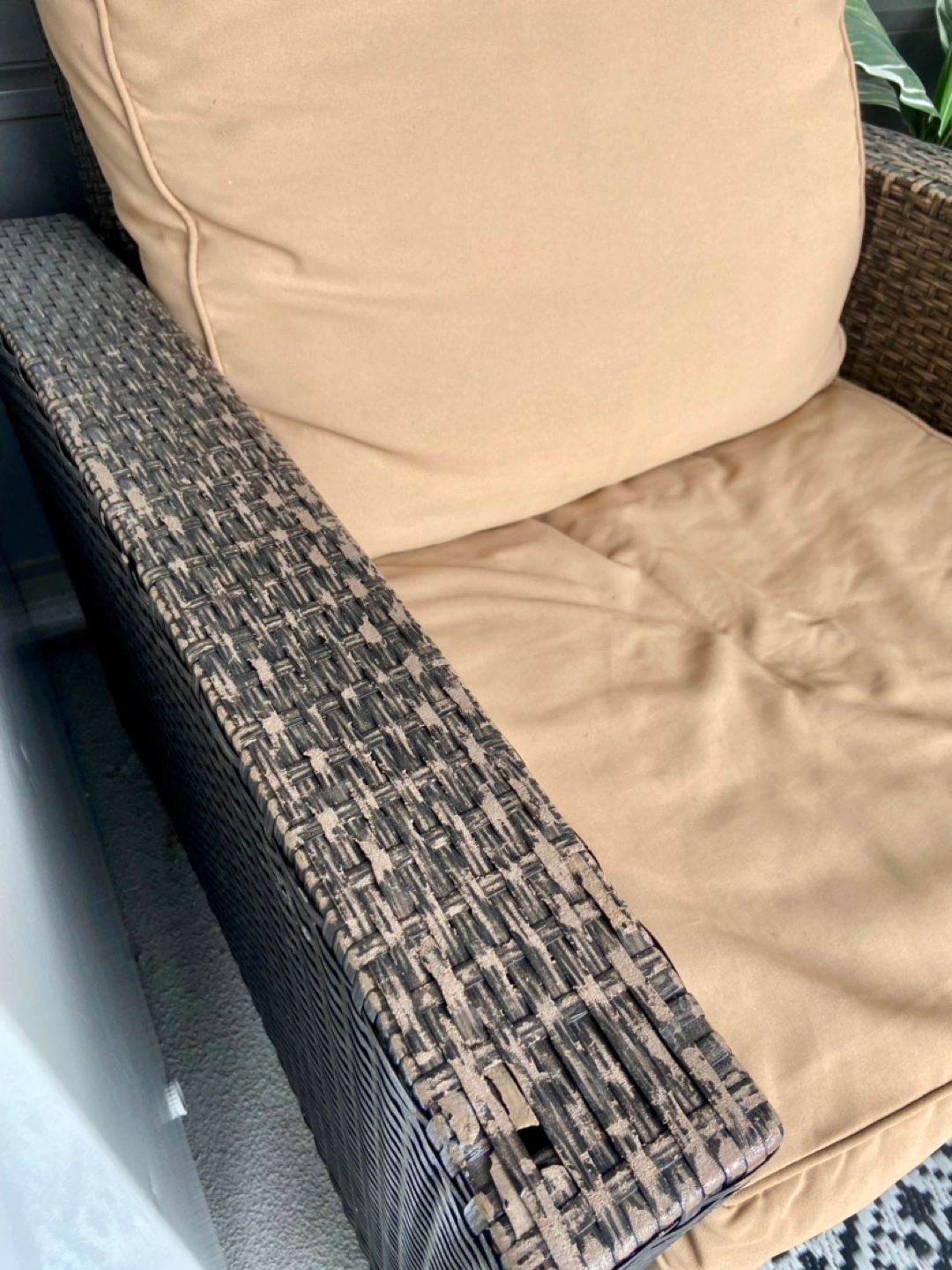 Very comfortable but don’t fit in our space, there is wear on the armrests as pictured. Wicker is a brown colour & cushions are tan