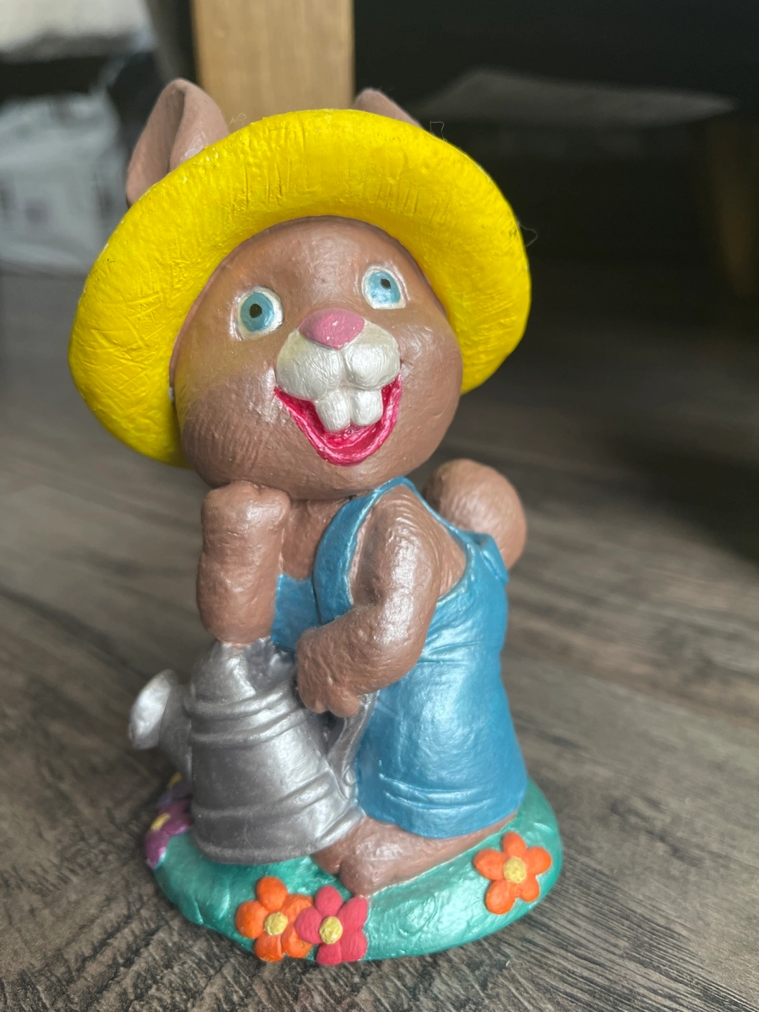 Cute bunny figurine. Brown bunny wears overalls and a yellow hat. Holds a watering can. Small flowers at the base. Resin material. Pick up east Maple Ridge