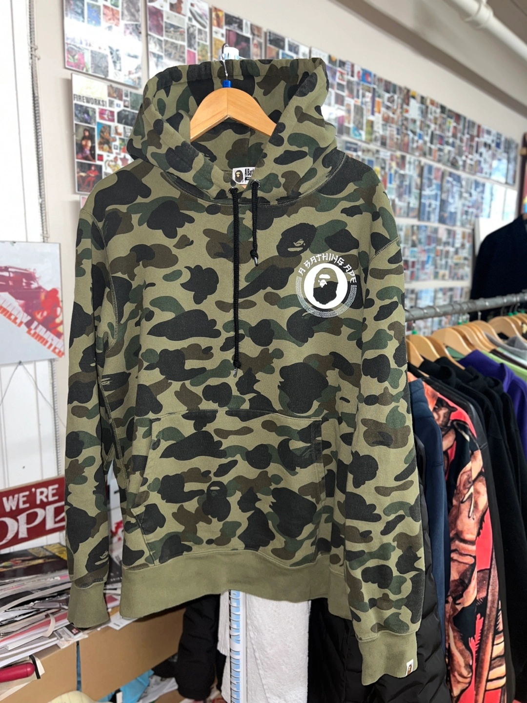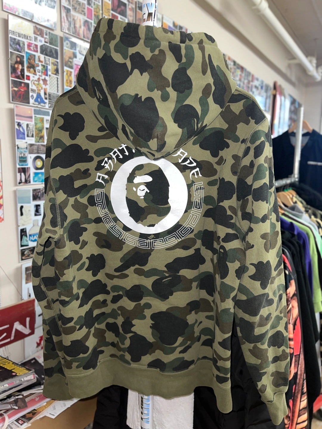 5Men's camouflage hoodie. Features a large Ape head logo on the back. Long sleeves, kangaroo pocket. Green and brown camouflage print.