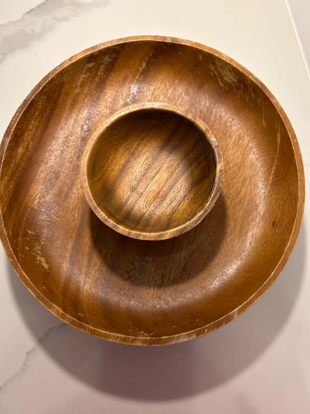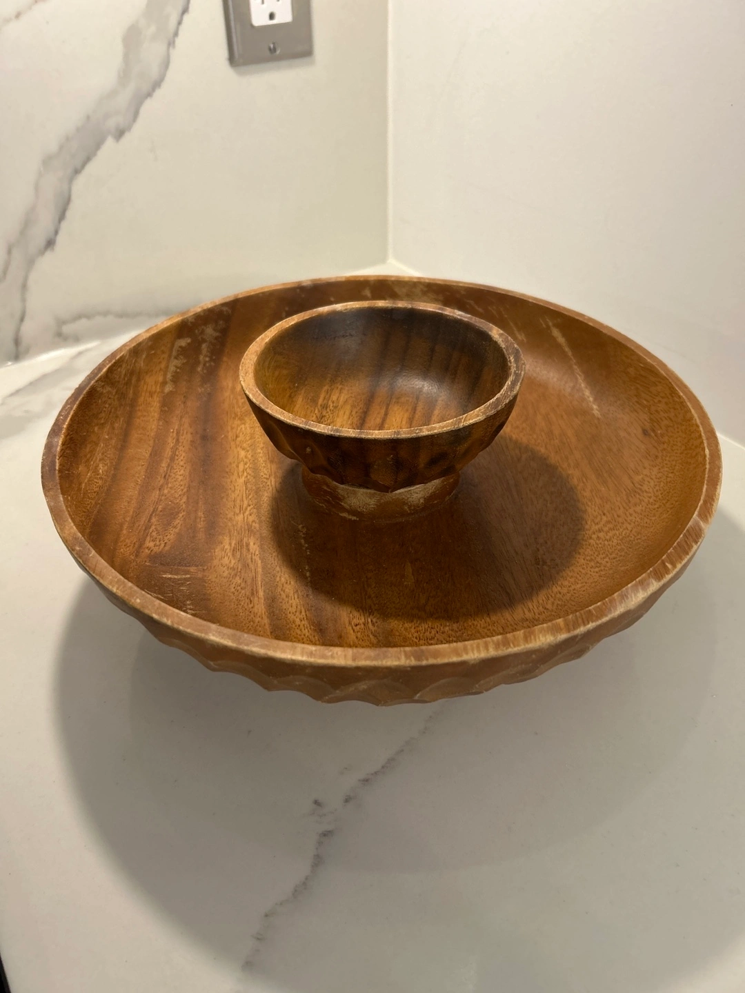 Hand-carved wooden serving bowl set. Features a large, shallow bowl and a smaller bowl in the centre. Perfect for snacks or dips. Unique design. Vintage.