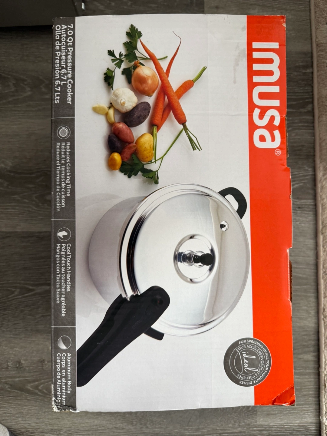 207.0 Qt pressure cooker. Aluminum body. Cool touch handles. Reduces cooking time.new in box