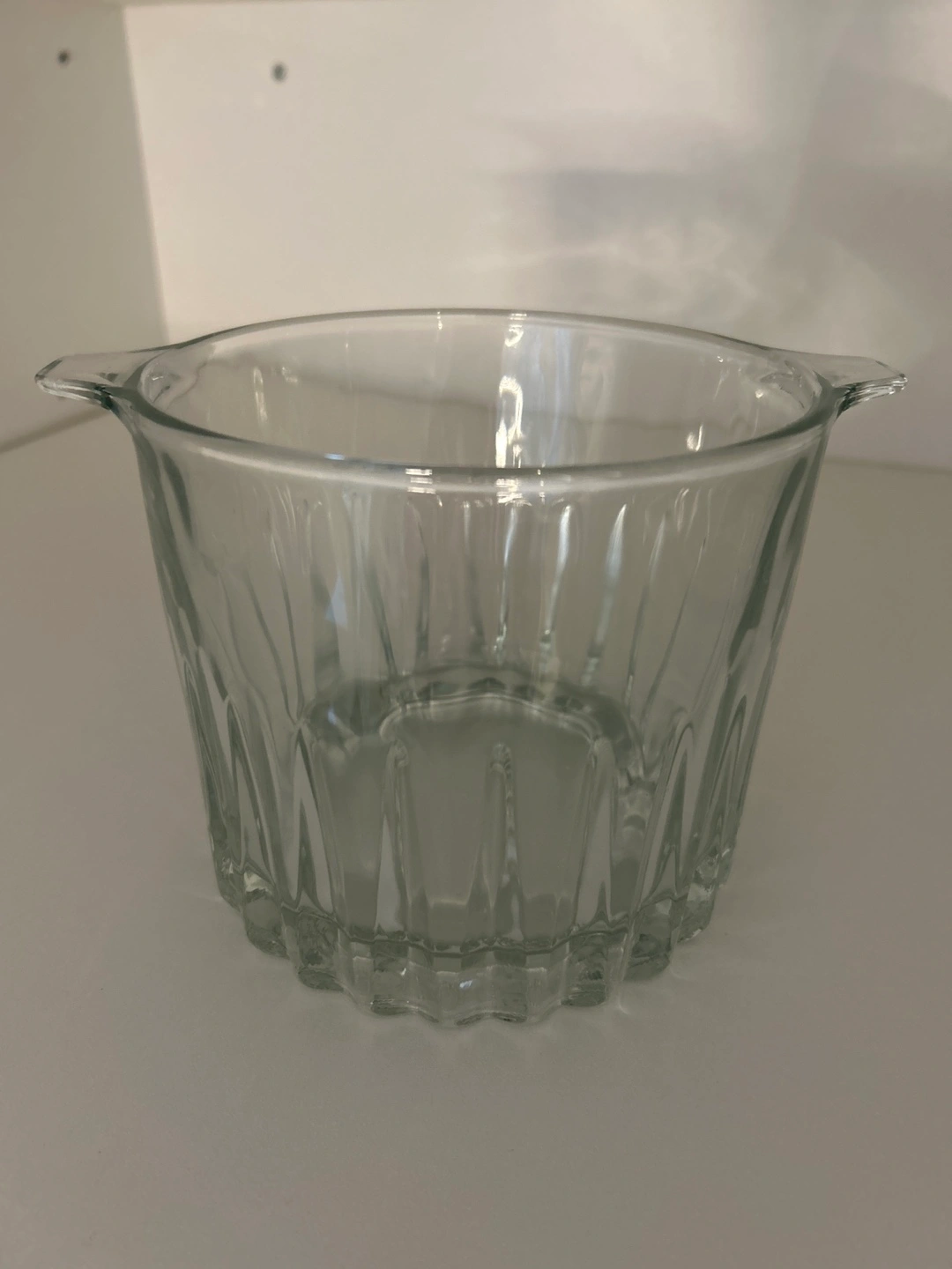 Clear glass bowl. Features vertical detailing and small handles on either side. Perfect for serving snacks or candies or ice