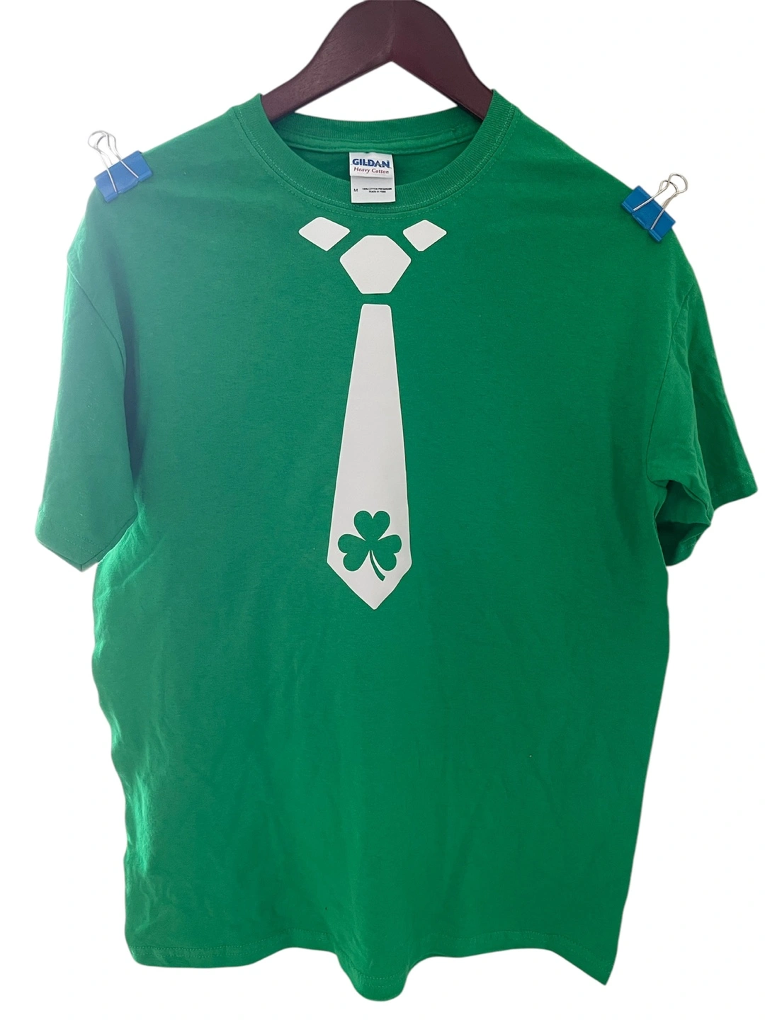 Green short sleeve t-shirt. Features a white tie graphic with shamrock. Size medium.