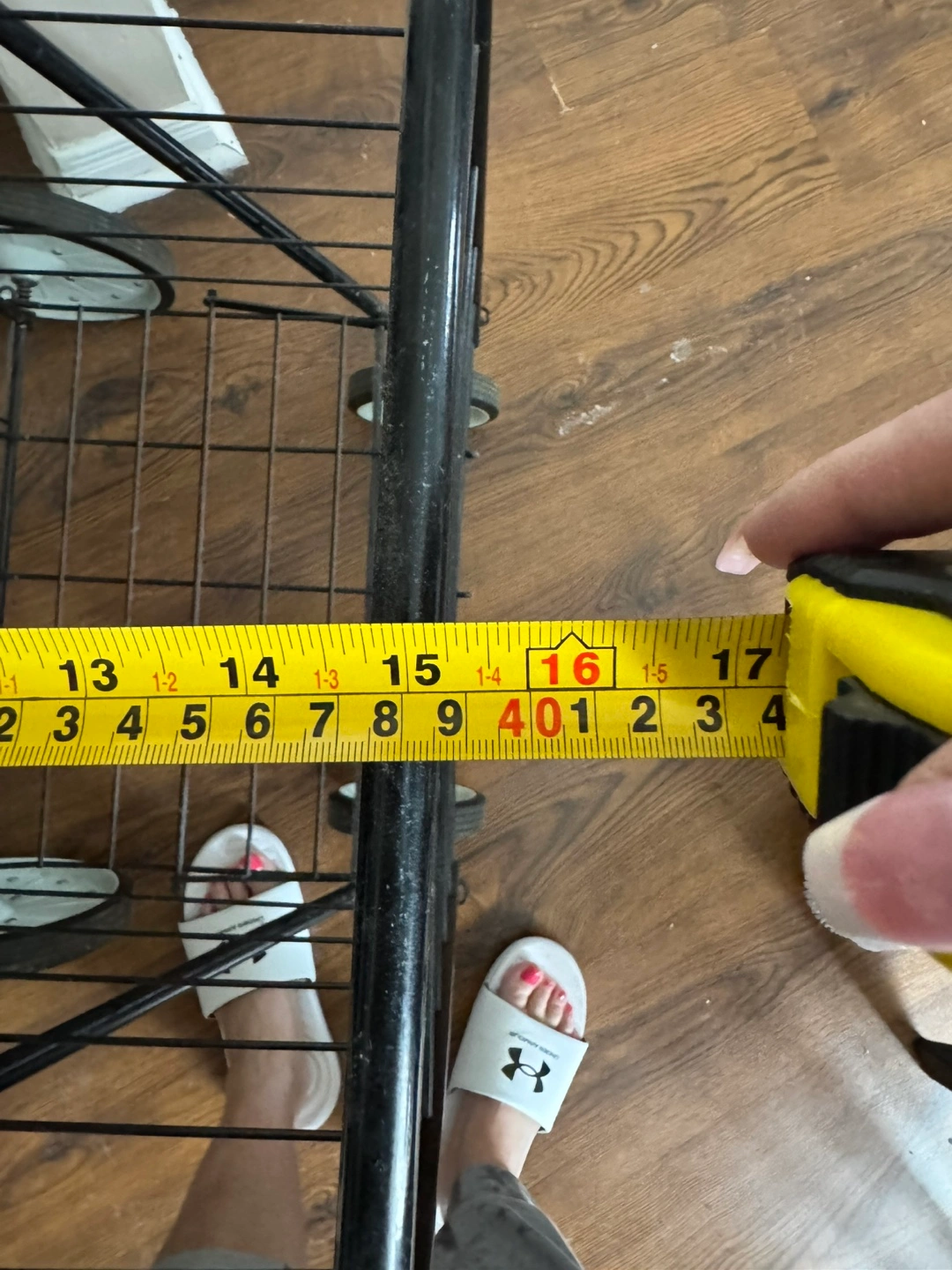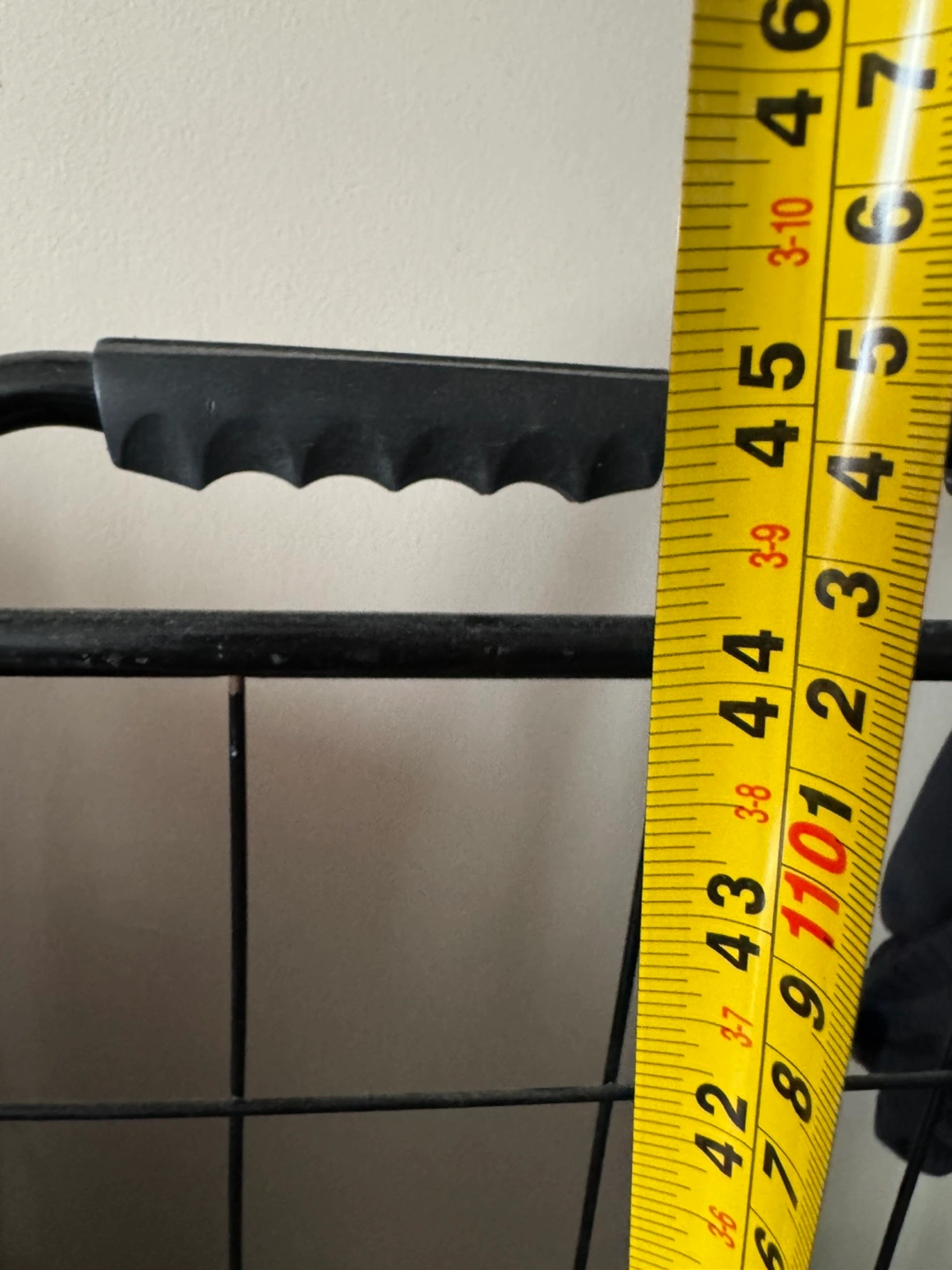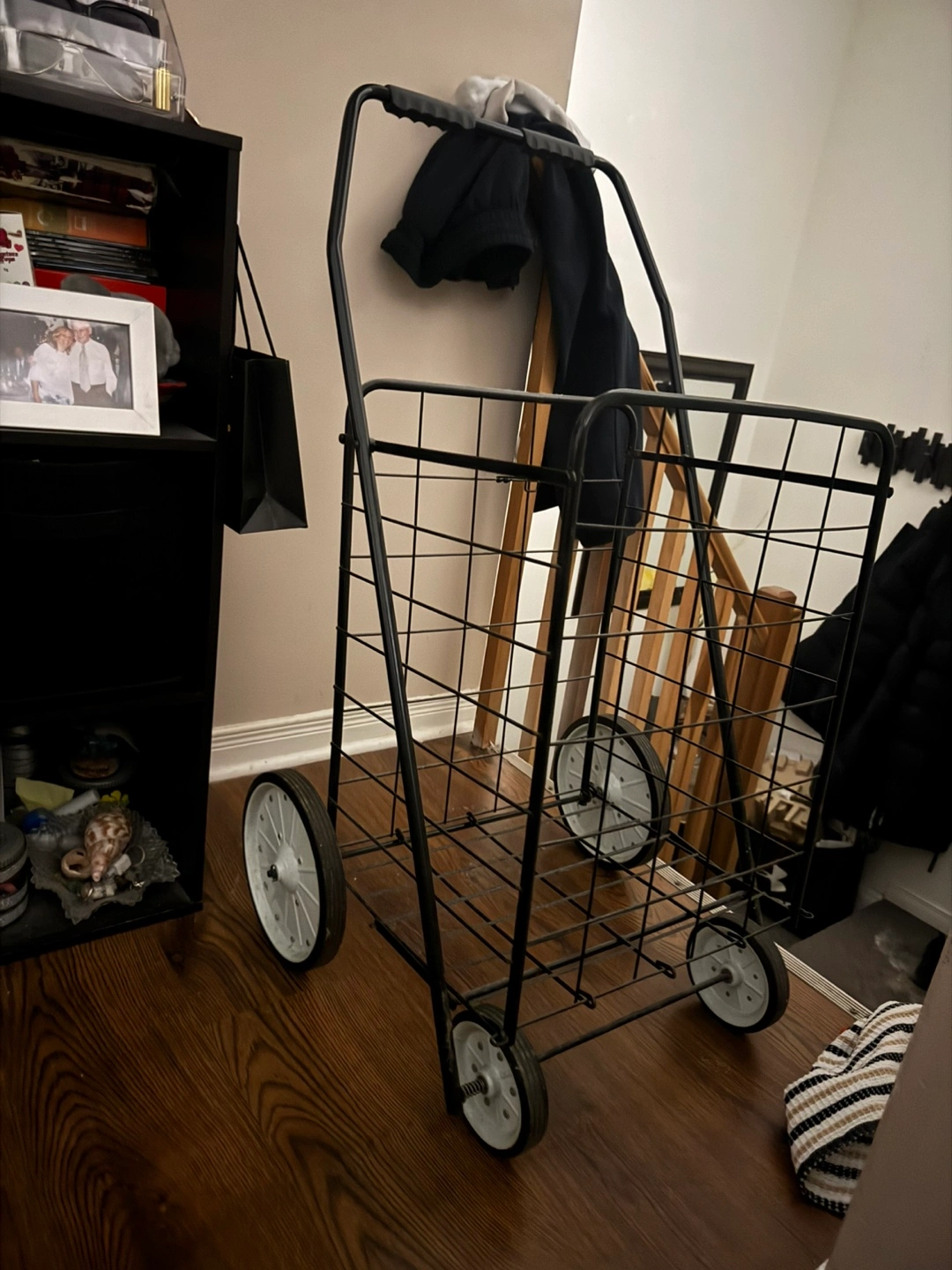Durable metal frame. Four wheels. Foldable design. Great for groceries or hauling. Measures approximately 40 cm wide and 16 inches tall.