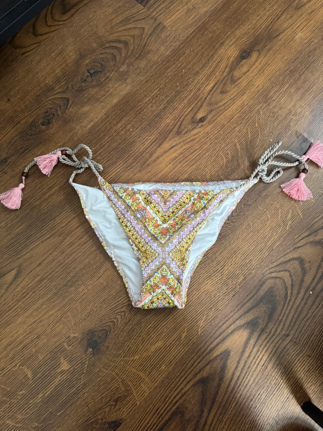 Printed bikini bottom. Features tassel ties. Size large