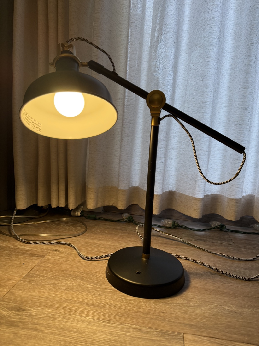 Modern style desk lamp. Black metal body, gold accents, adjustable arm. Includes energy efficient light bulb.